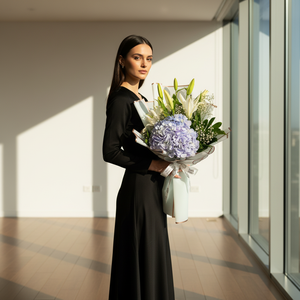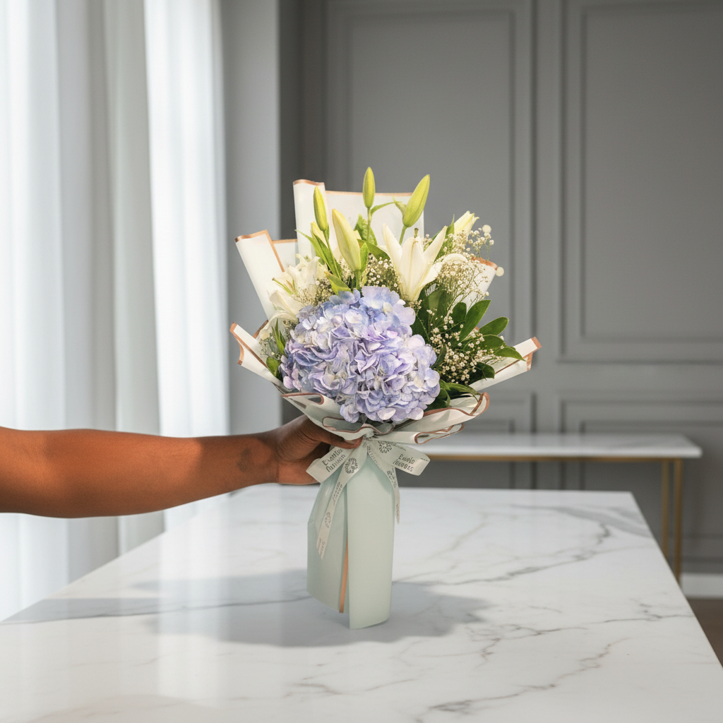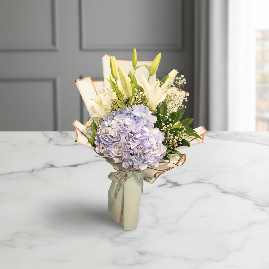 A refined arrangement featuring a soft blue hydrangea as the centerpiece, gracefully paired with pristine white lilies and delicate baby’s breath. Accented with fresh green foliage and wrapped in ivory paper with subtle golden edges, this bouquet exudes calm sophistication and timeless beauty. Perfect for expressing admiration, peace, or heartfelt emotions with a touch of elegance.