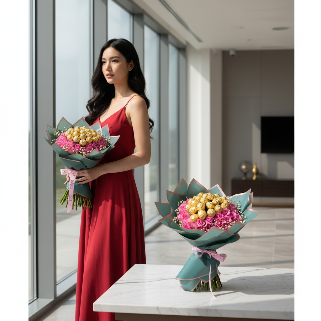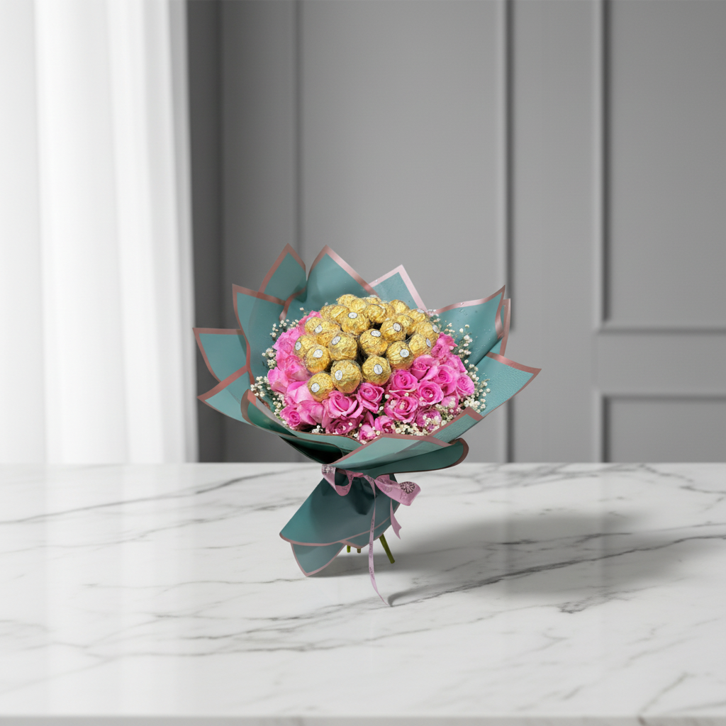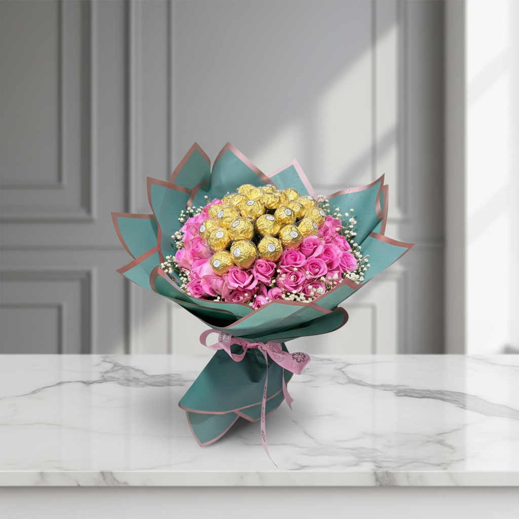 A stunning combination of sweetness and charm, the Blush Gold Elegance Bouquet is designed to impress at first glance. Featuring delicate pink roses paired with luxurious Ferrero Rocher chocolates, this bouquet creates a perfect harmony of beauty and indulgence.
