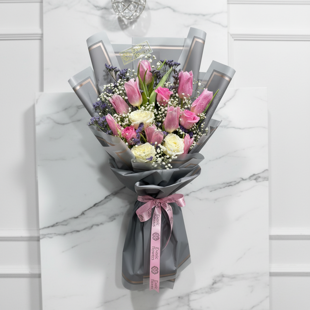 Blush Harmony Tulip Bouquet is a graceful arrangement featuring fresh pink tulips paired with elegant white roses, delicate baby’s breath, and subtle purple fillers. Beautifully wrapped in premium grey waterproof paper and finished with a soft pink ribbon, this bouquet offers a modern, classy look perfect for any special moment.