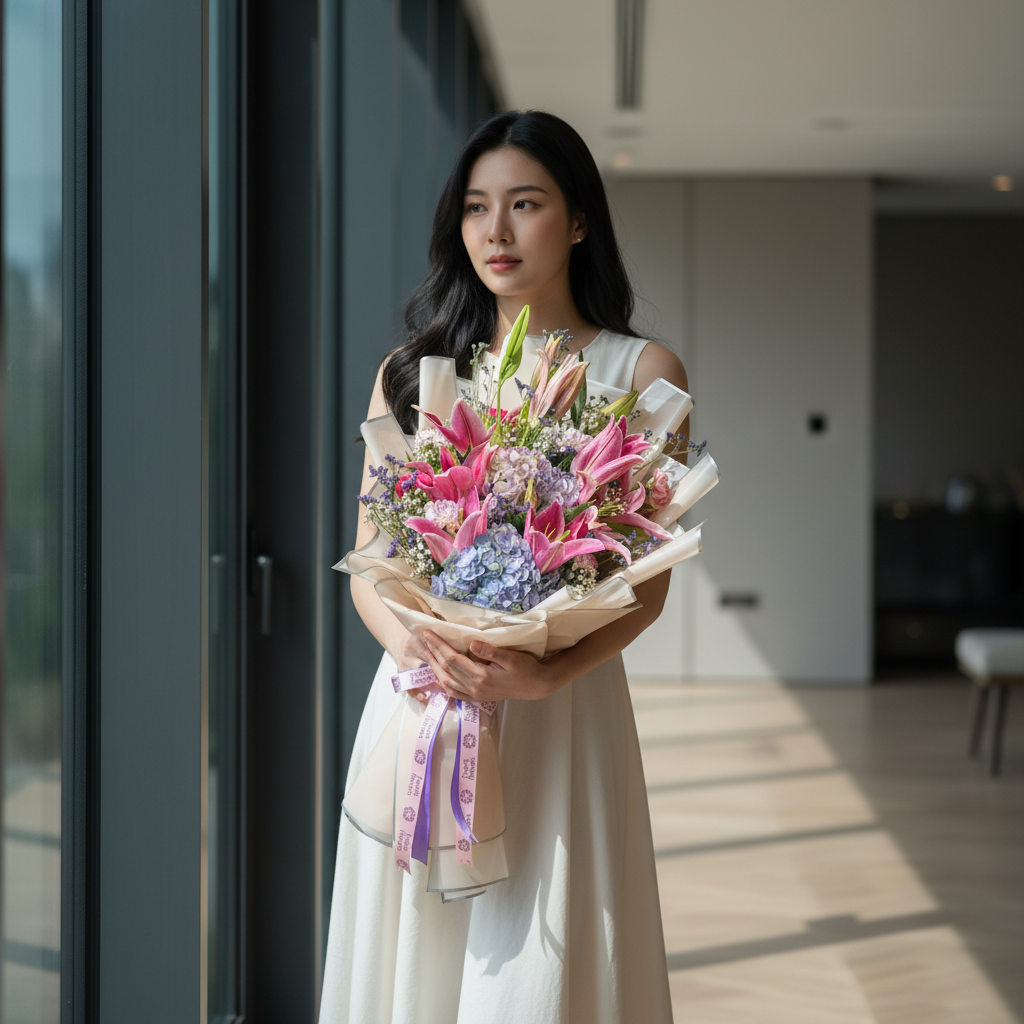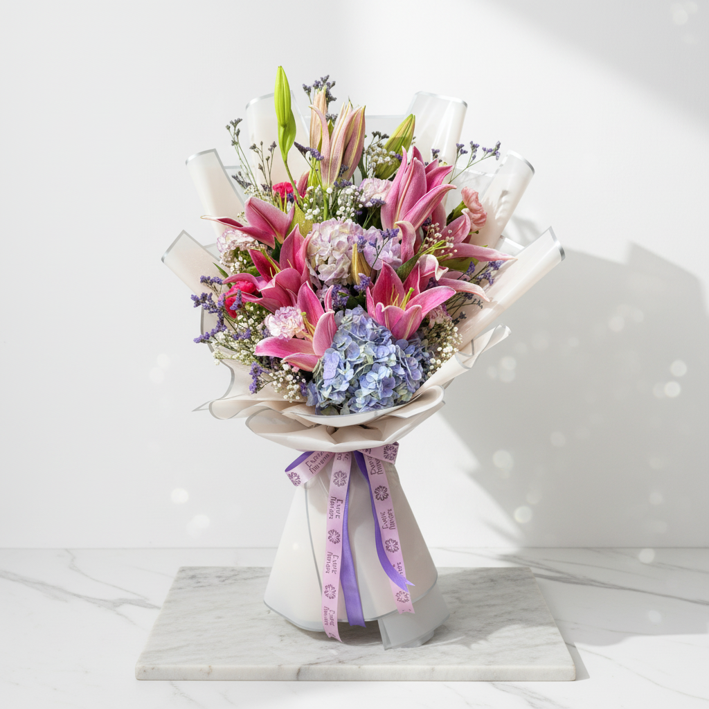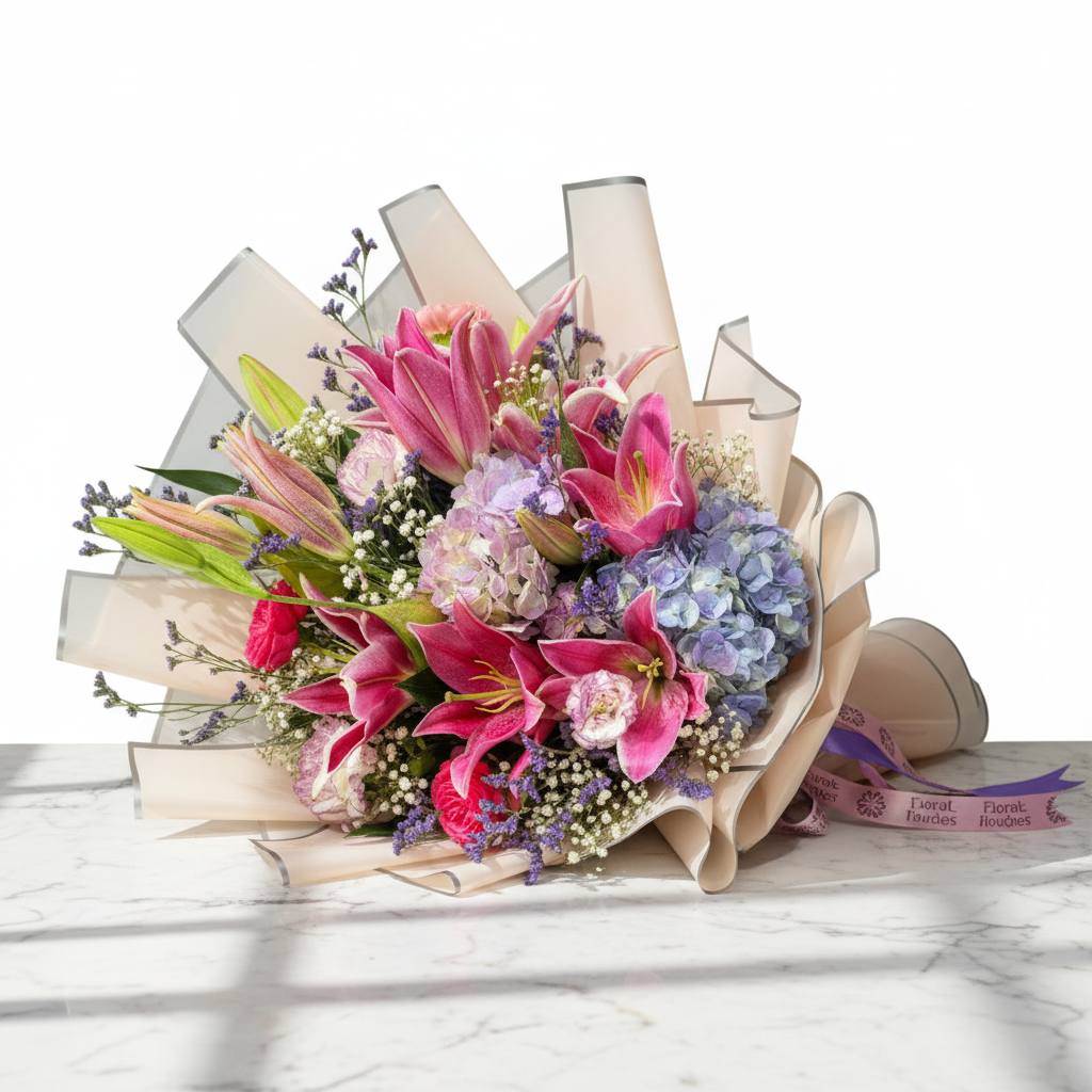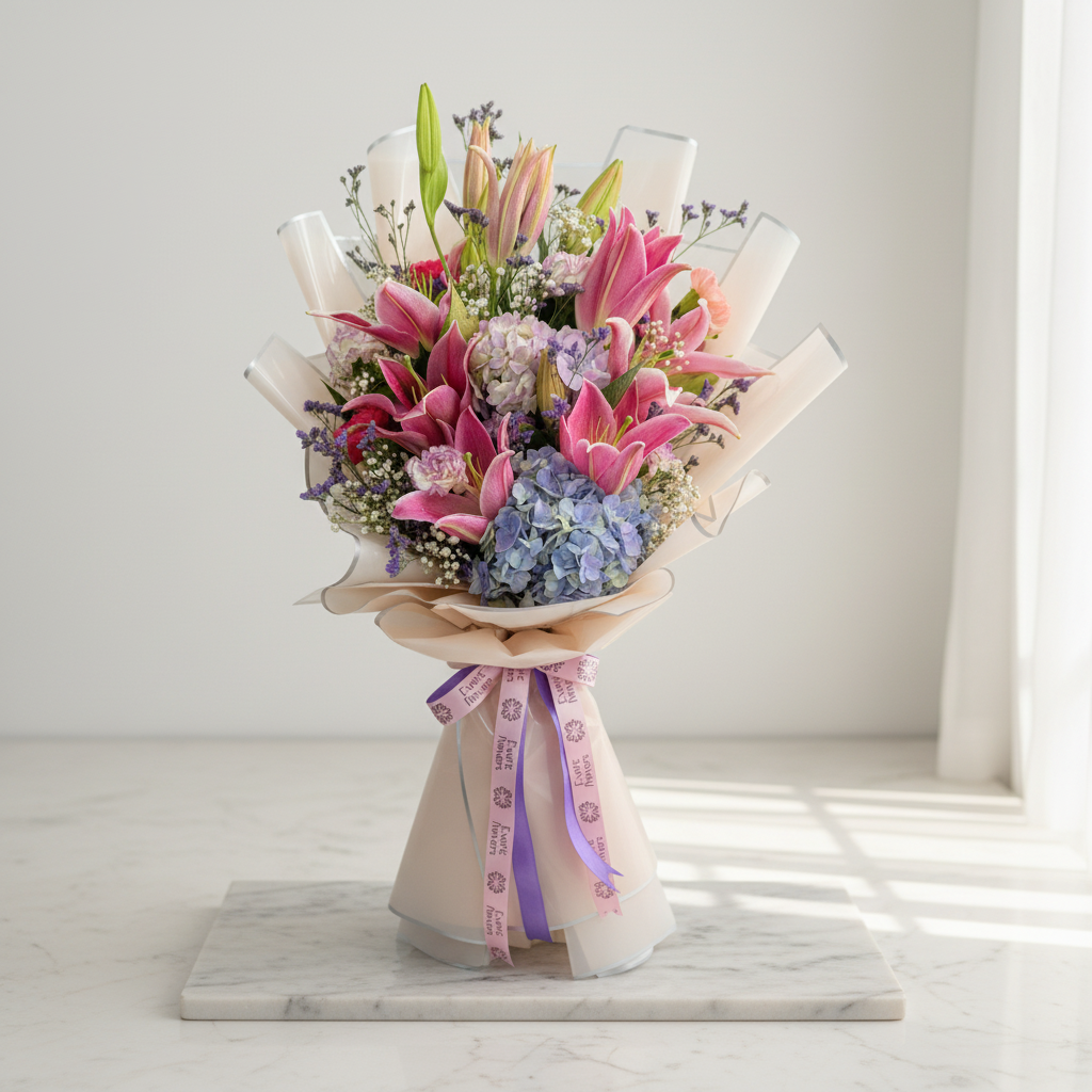 A graceful and premium floral arrangement featuring vibrant pink lilies paired with soft blue hydrangeas and delicate pastel fillers. Wrapped in elegant nude-toned paper and finished with a charming ribbon, this bouquet exudes sophistication and freshness. The combination of bold lilies and soothing hydrangeas makes it perfect for birthdays, anniversaries, congratulations, or heartfelt gifting moments. A true expression of elegance and beauty in every bloom.