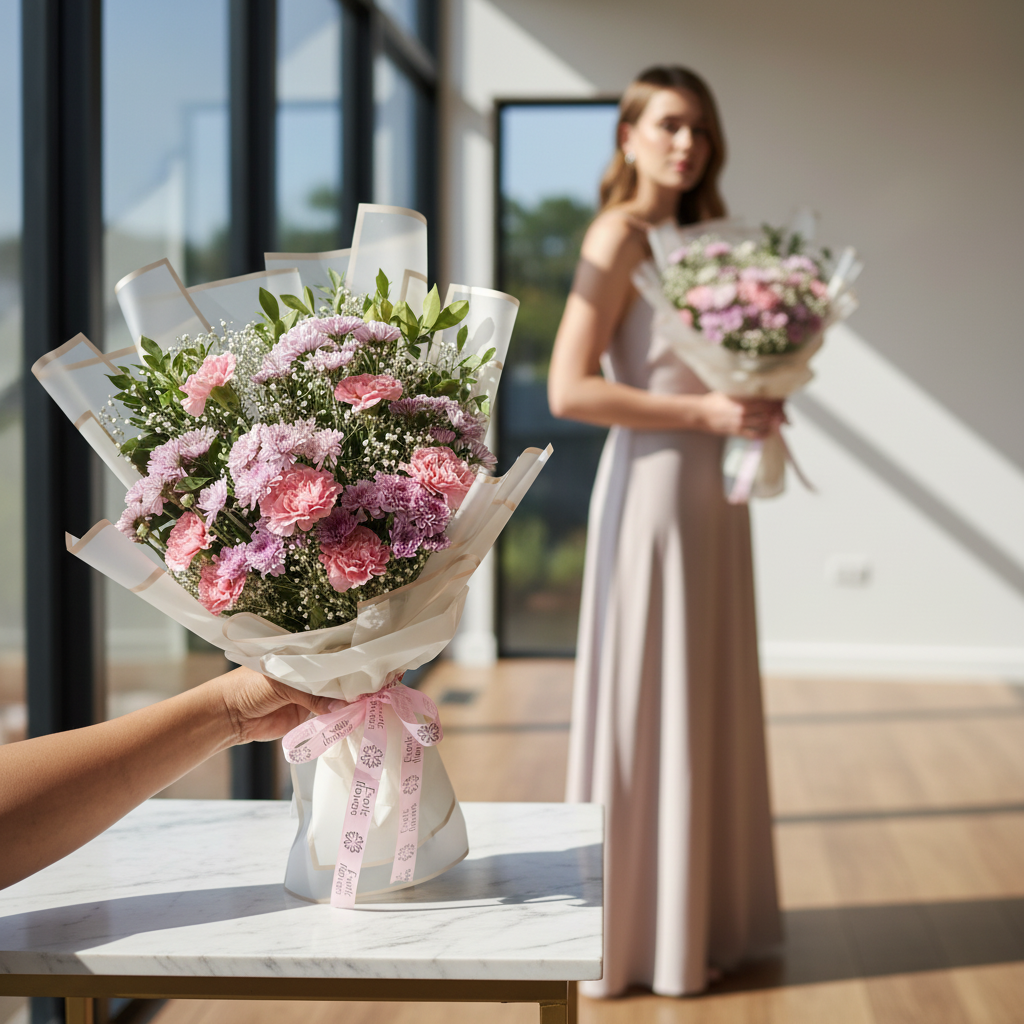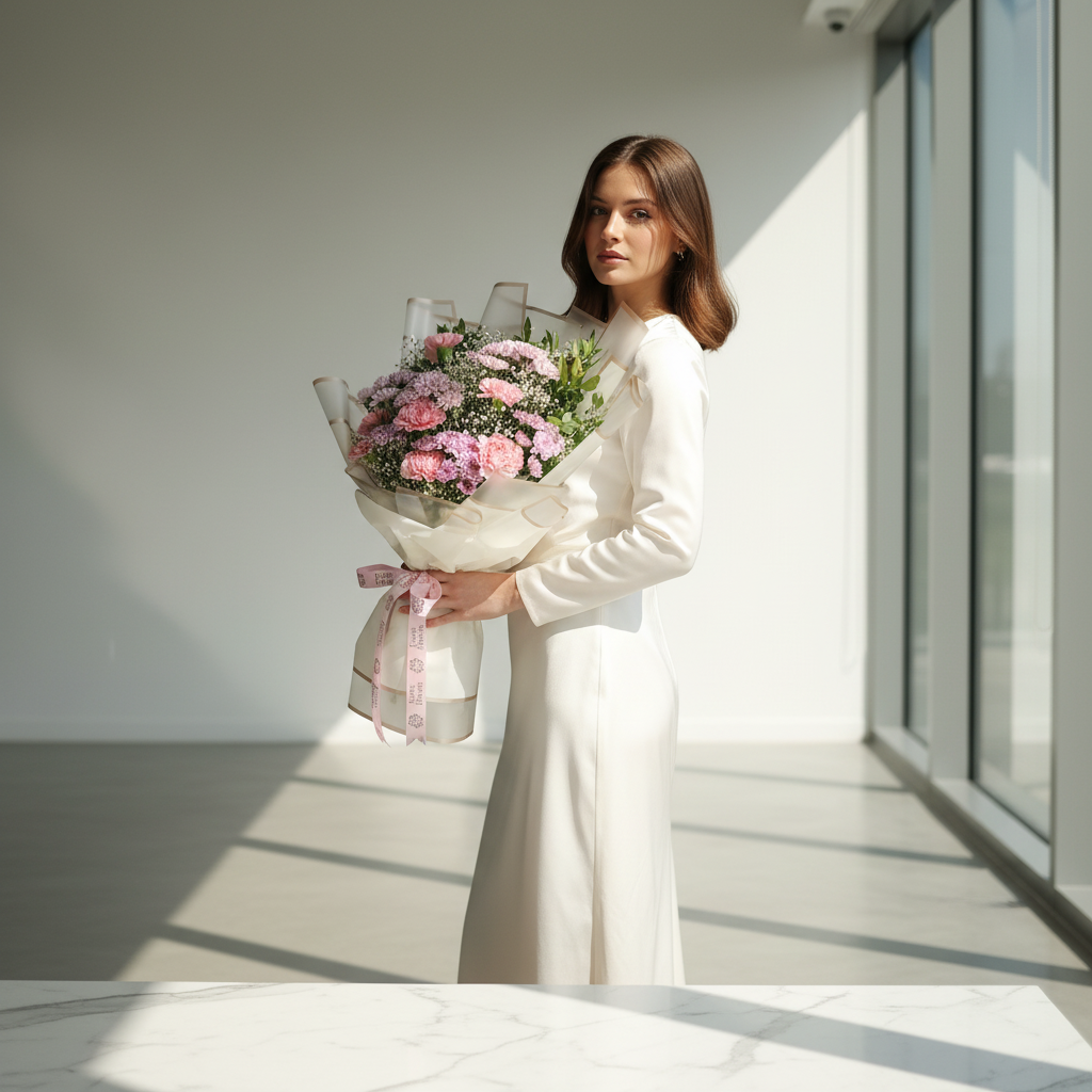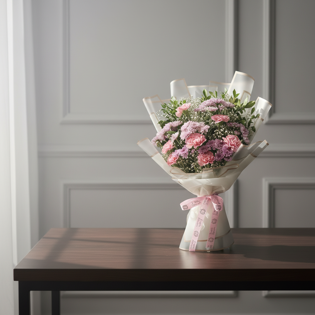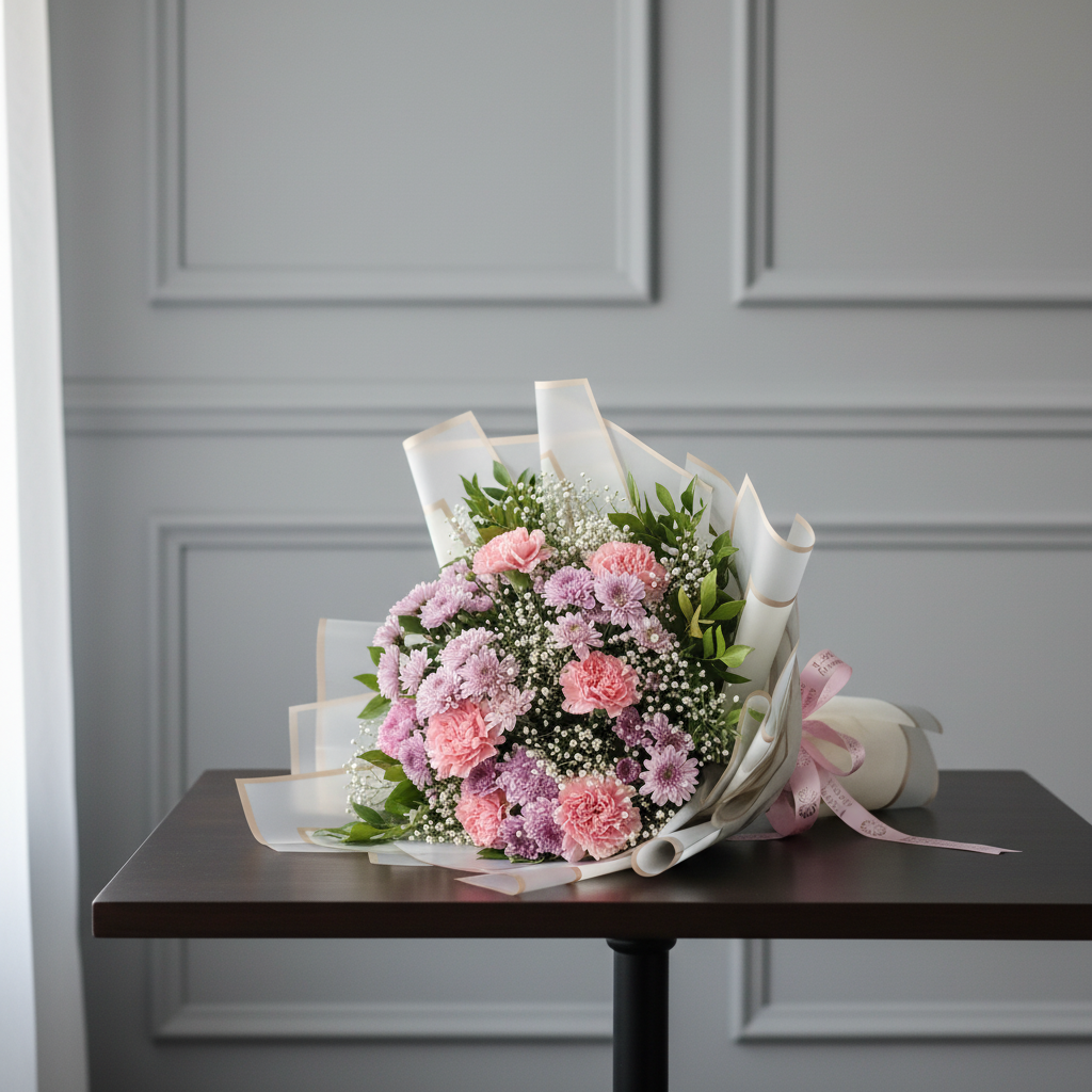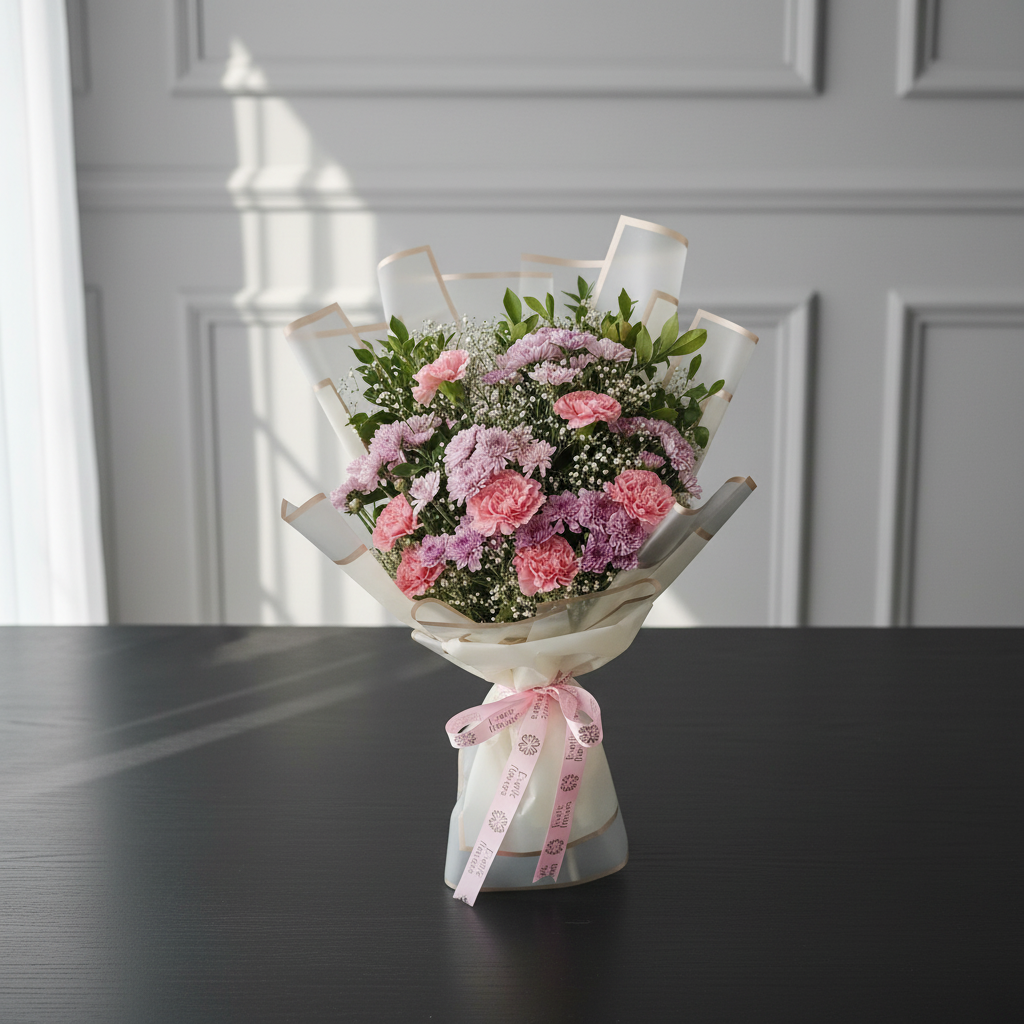 A soft and elegant arrangement featuring delicate pink carnations and pastel chrysanthemums, beautifully wrapped in translucent ivory paper with subtle golden edges. Accented with fresh green foliage and tied with a graceful pink ribbon, this bouquet radiates calm, warmth, and understated luxury—perfect for heartfelt moments, gentle celebrations, or simply brightening someone’s day.