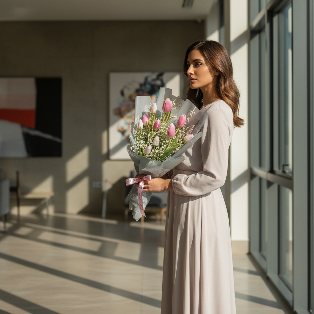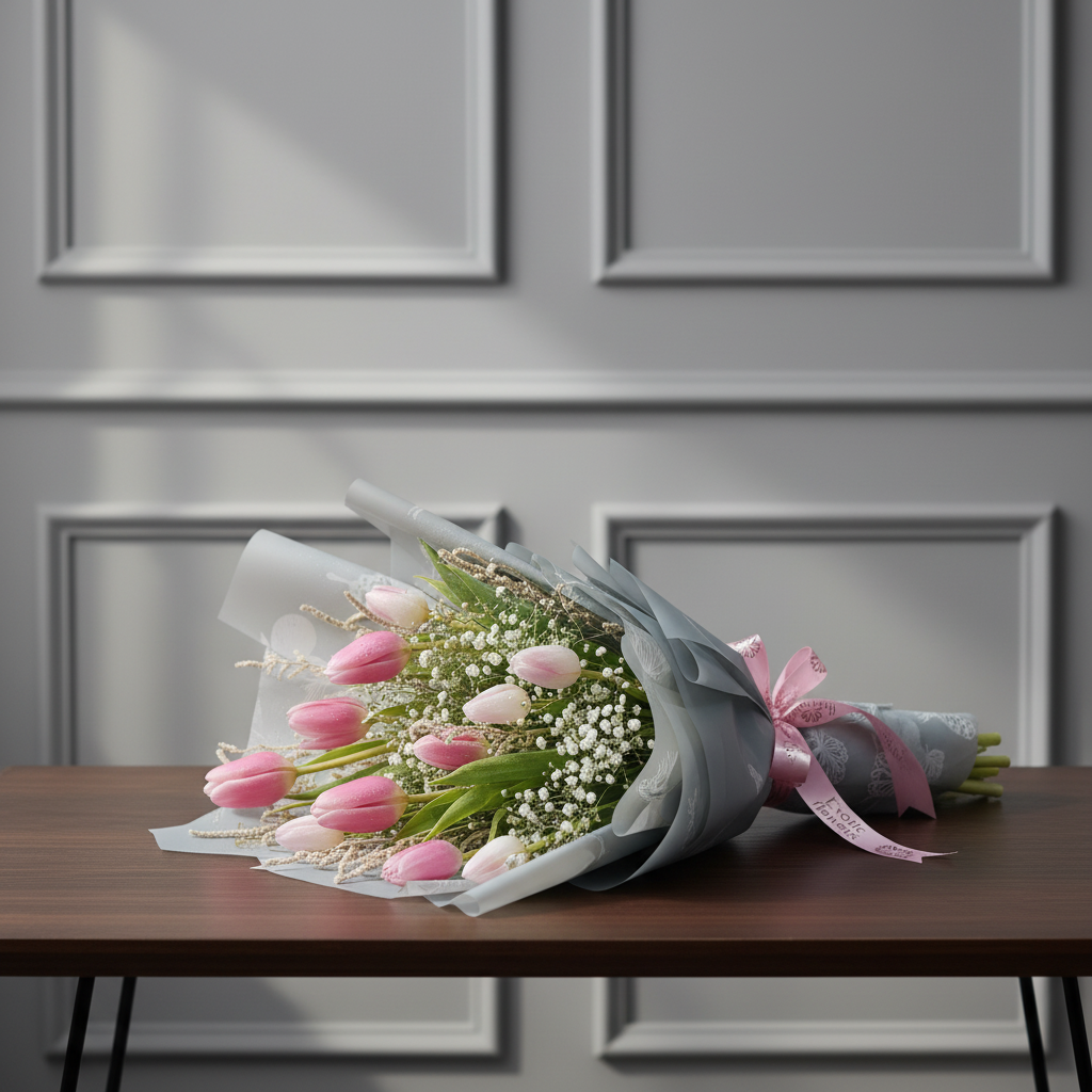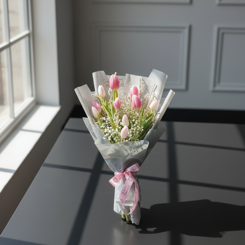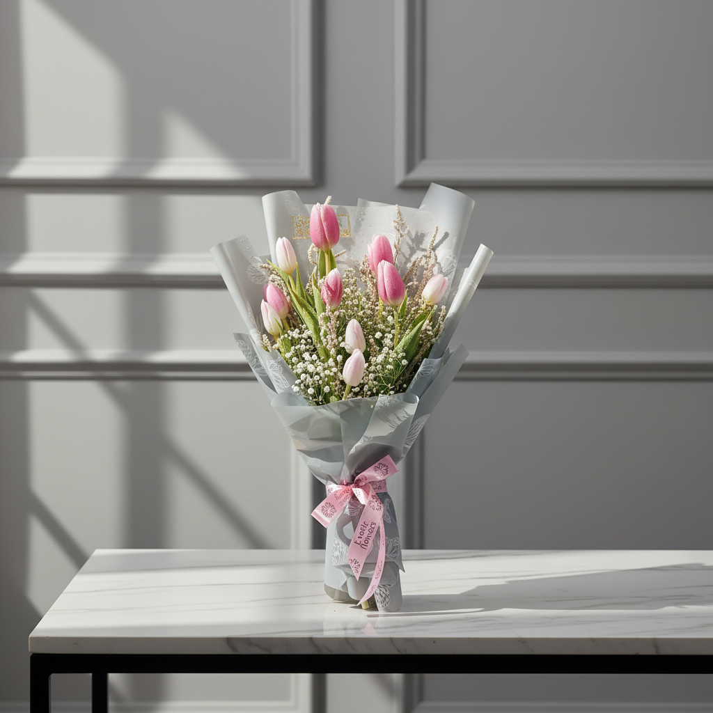 A soft and elegant bouquet of fresh pink tulips, delicately paired with airy white baby’s breath and subtle dried accents. Wrapped in translucent pastel paper and finished with a charming pink ribbon, this arrangement exudes simplicity, grace, and gentle affection. Blush Tulip Whisper is perfect for expressing love, appreciation, or bringing a calm, sophisticated touch to any moment.