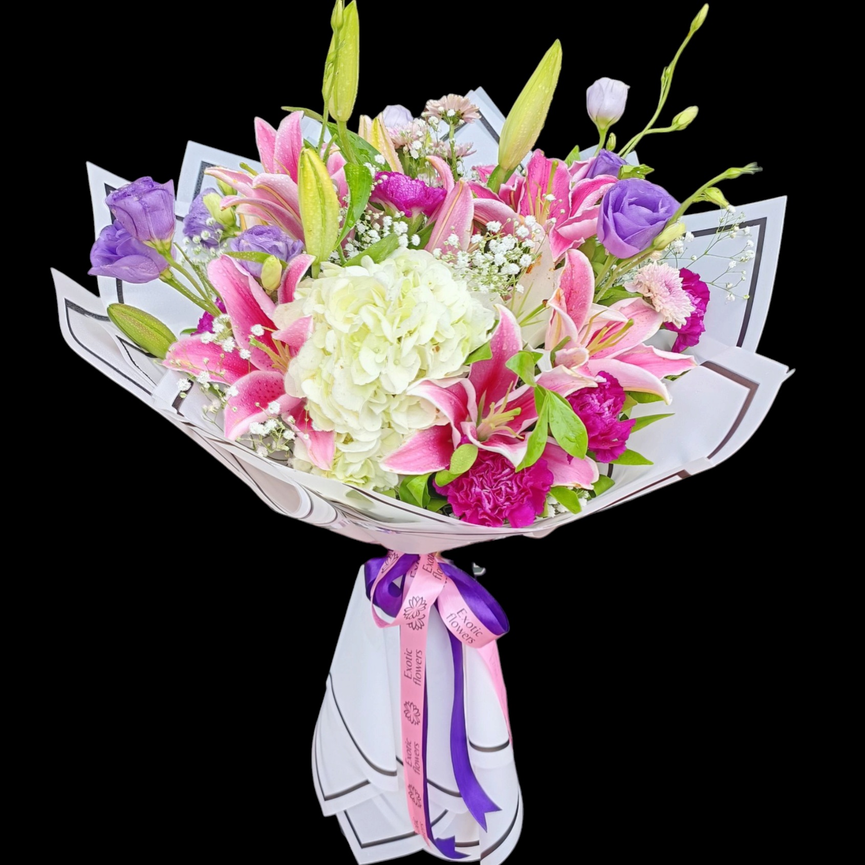 A charming hand-tied bouquet featuring pink lilies, white hydrangea, purple lisianthus, bright pink carnations, and baby’s breath, beautifully wrapped in elegant white paper and finished with pink and purple ribbons for a graceful look.