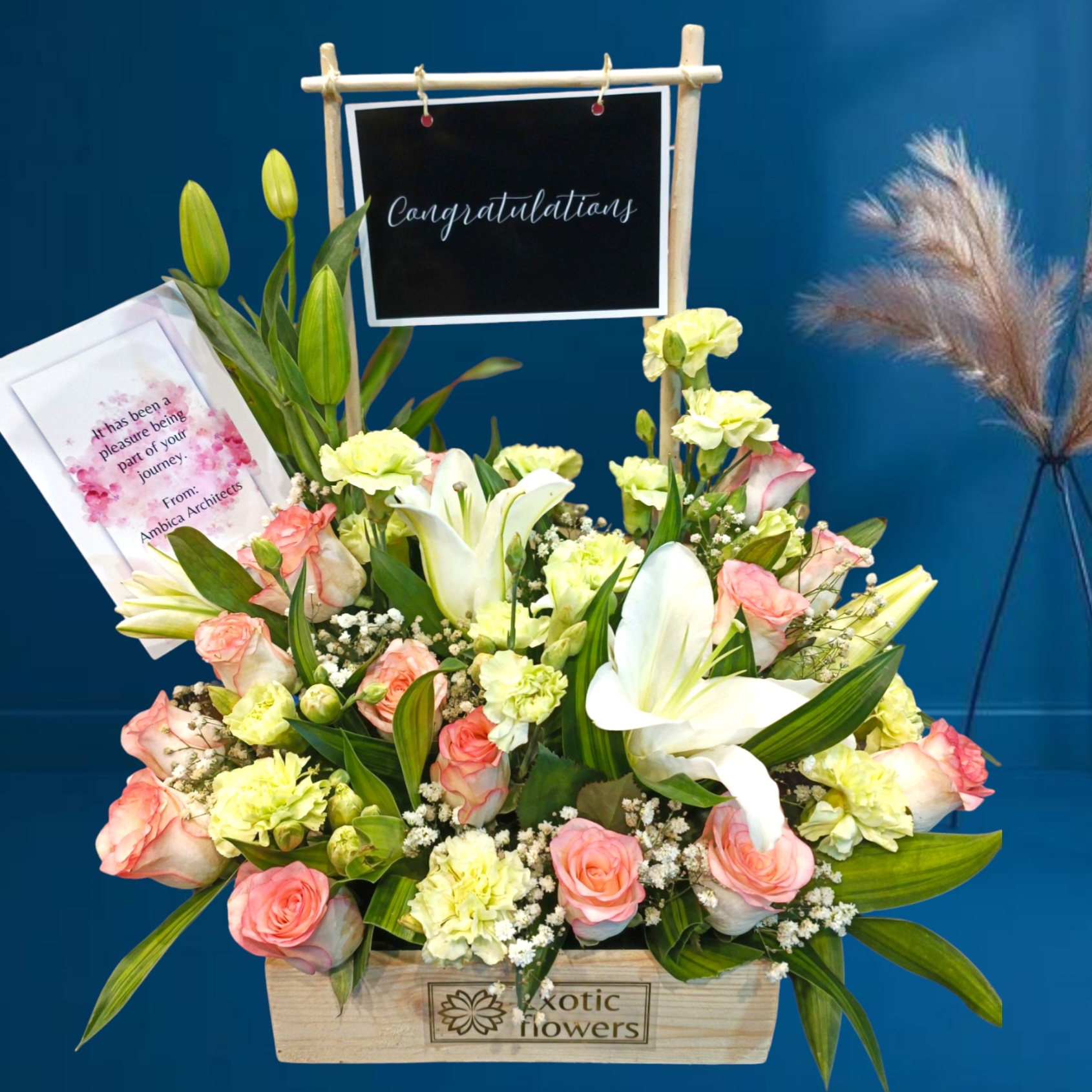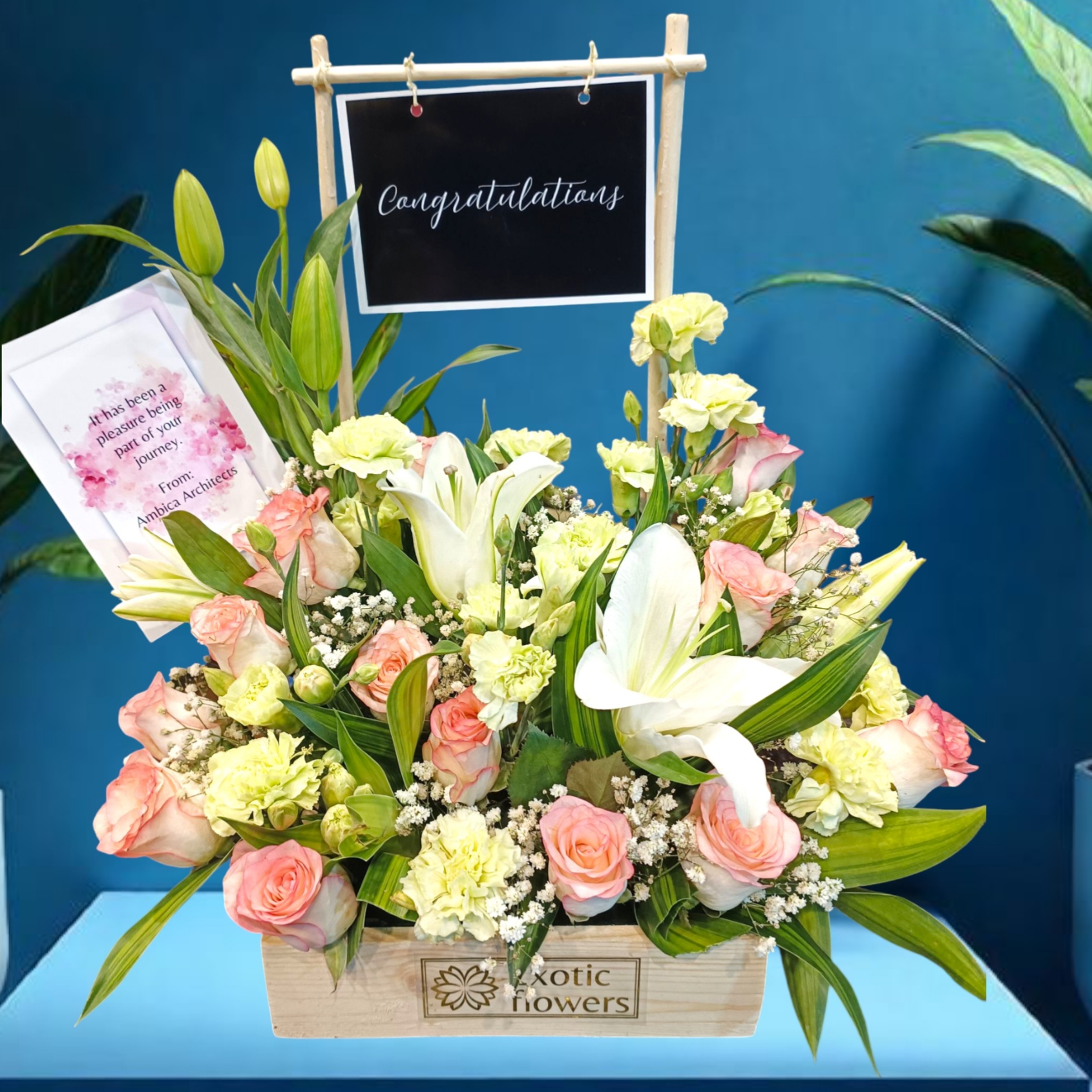 A charming wooden box bouquet featuring a mix of elegant white lilies, soft peach-pink roses, cheerful yellow carnations, and delicate baby’s breath, beautifully arranged with lush green foliage. The bouquet is adorned with a congratulatory message, making it a perfect gift to celebrate achievements, milestones, or special occasions.