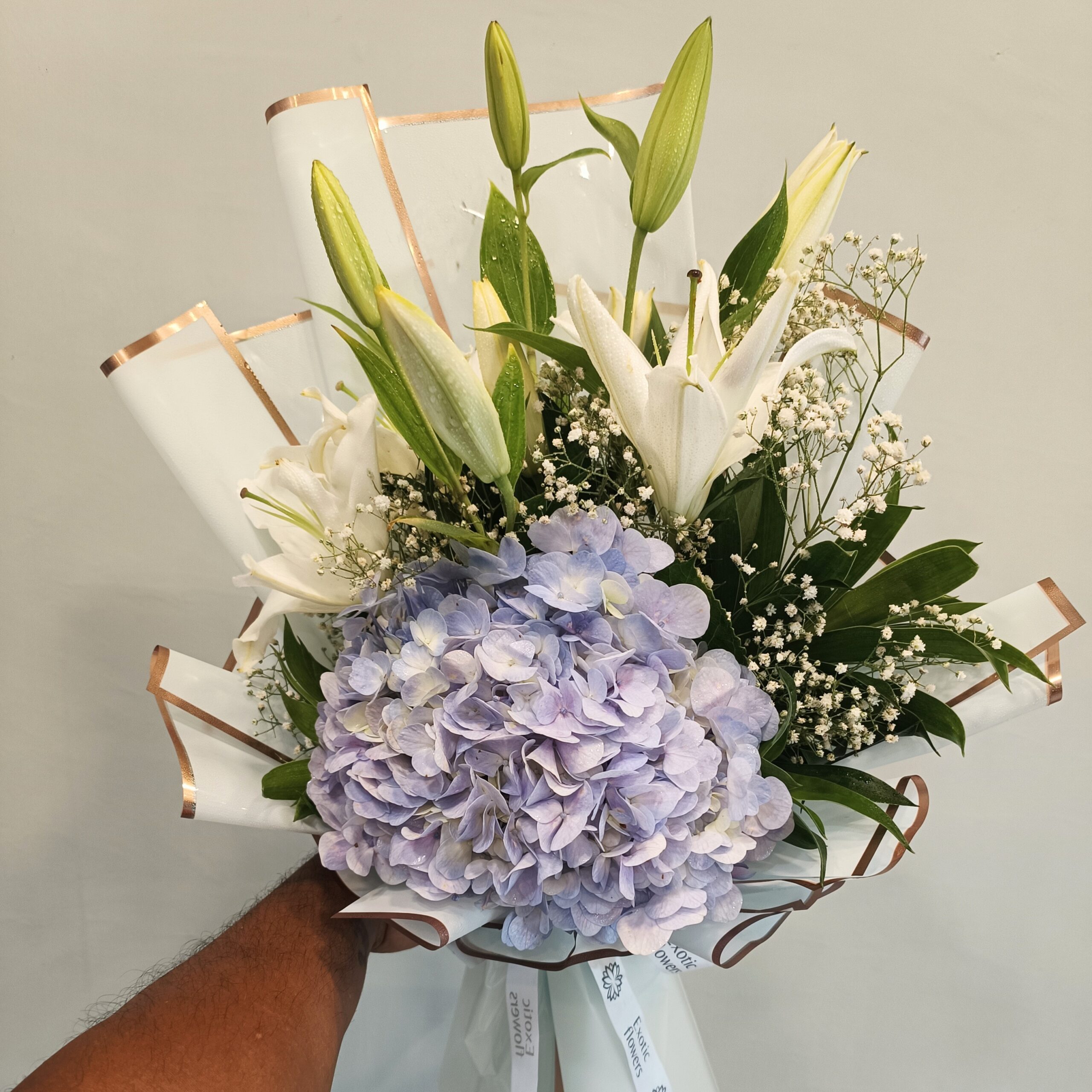 This exquisite hand-tied bouquet features a stunning combination of fresh blooms, carefully arranged to create a graceful and luxurious look. At the heart of the bouquet lies a lush cluster of soft lavender Hydrangeas, symbolizing heartfelt emotions and gratitude. Surrounding them are elegant White Lilies, both in full bloom and budding, representing purity and new beginnings. Delicate sprigs of Baby’s Breath and fresh green foliage add texture and charm.