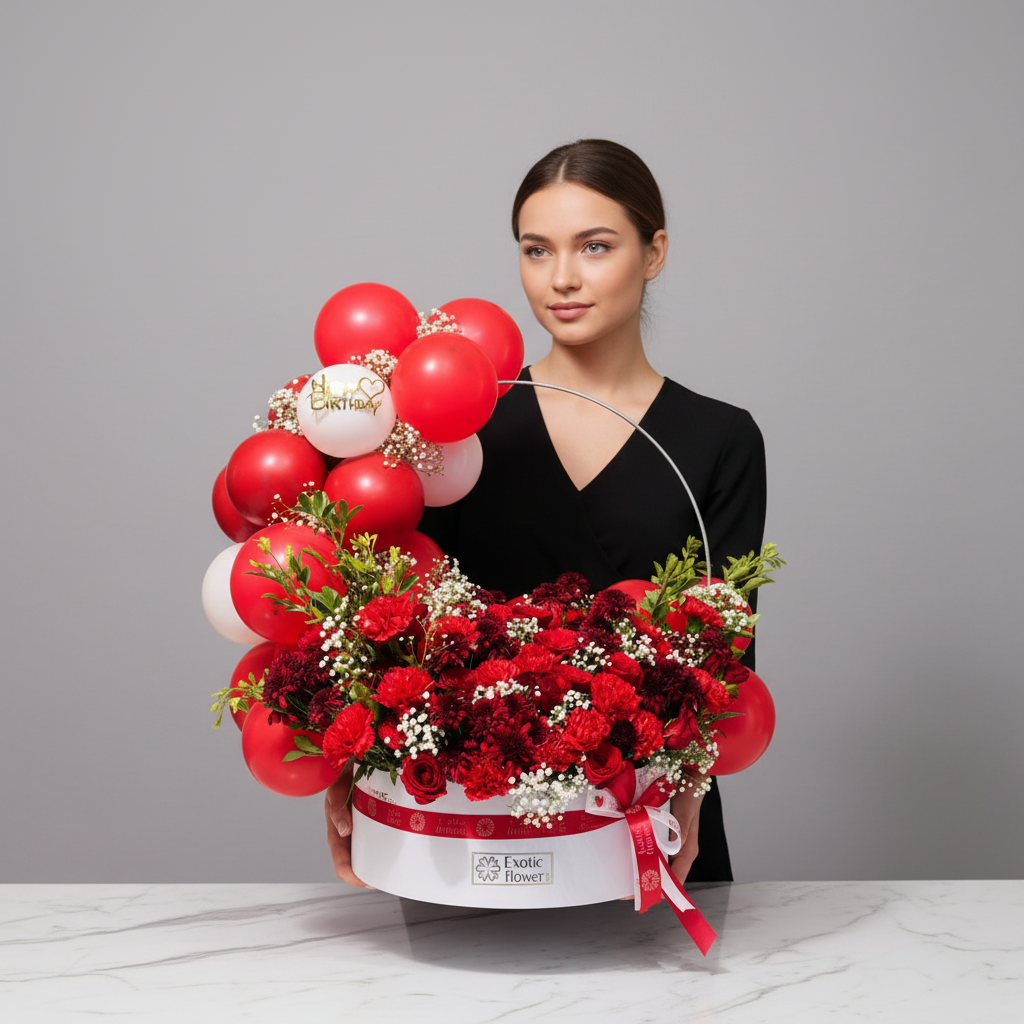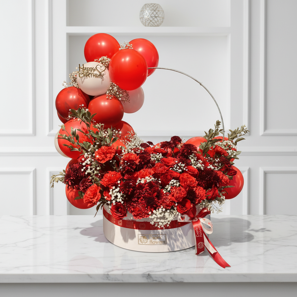 Paired with vibrant red and white balloons—including a “Happy Birthday” balloon—beautifully styled on a modern metal arch, this arrangement creates a stunning visual impact. Presented in an elegant round floral box with a matching ribbon, it’s perfect for surprise gifting and stylish celebrations.
