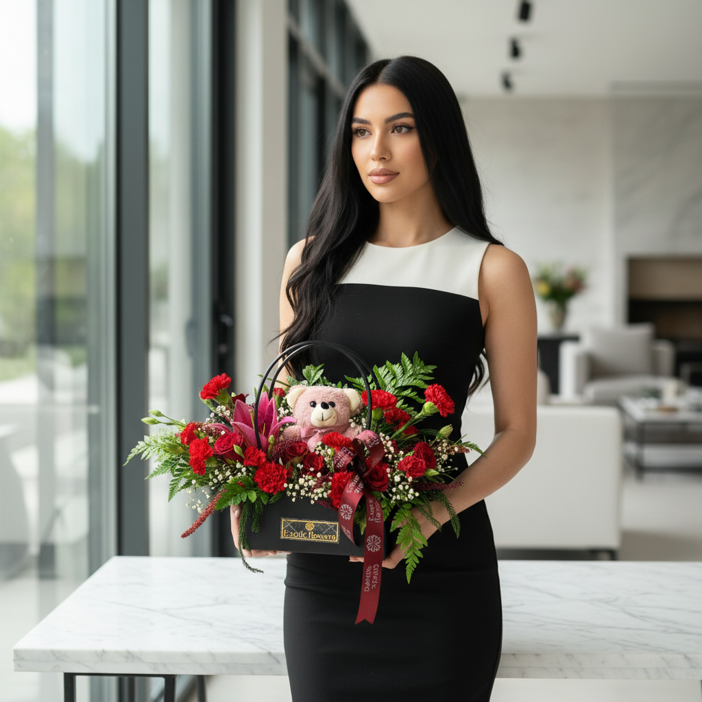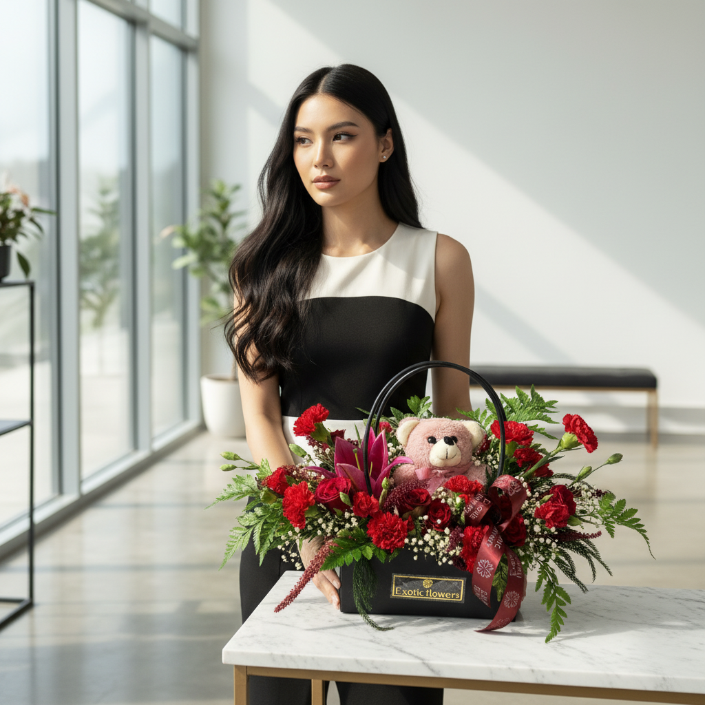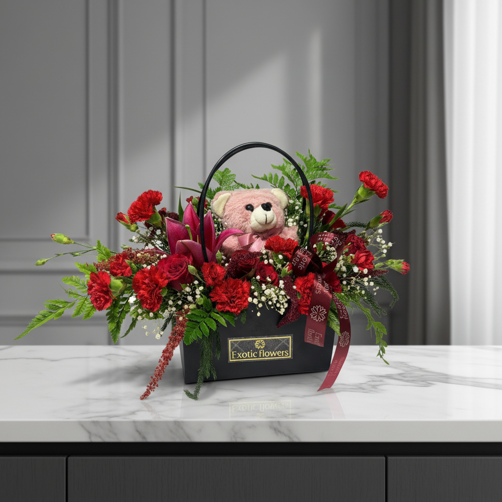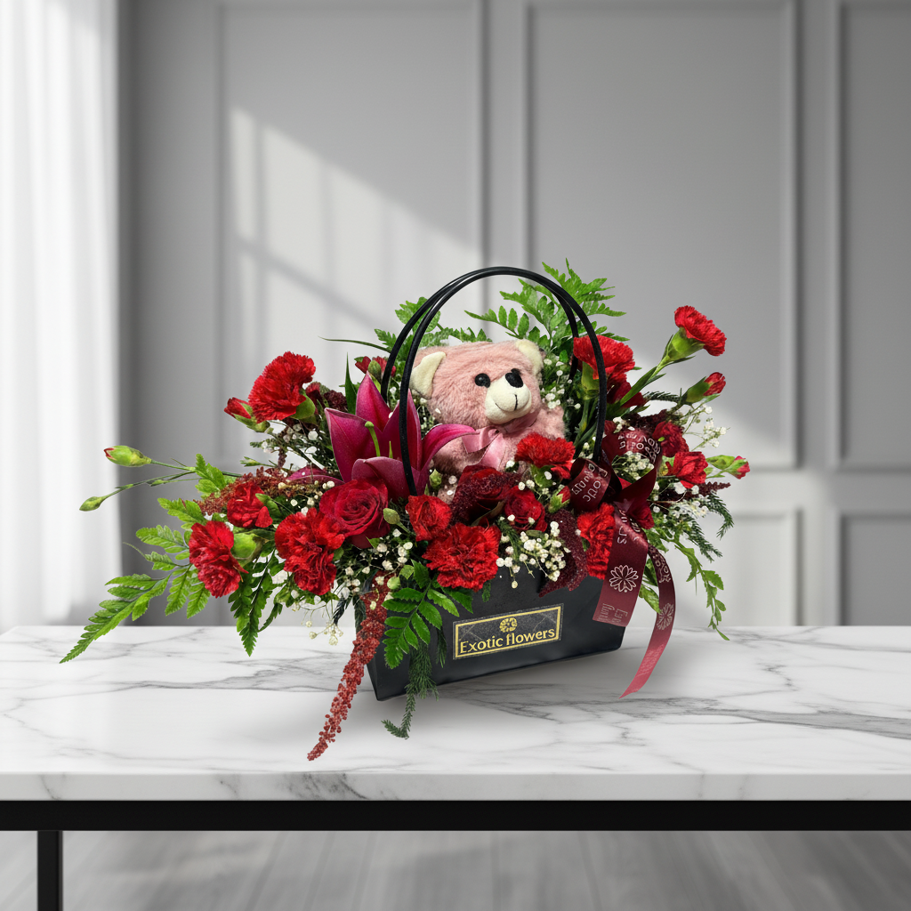 Bold, romantic, and irresistibly charming — the Crimson Cuddle Romance Basket is the perfect gift to express deep love and affection. This stunning arrangement features a rich blend of red roses, vibrant carnations, and elegant fillers, beautifully arranged around an adorable teddy bear centerpiece.