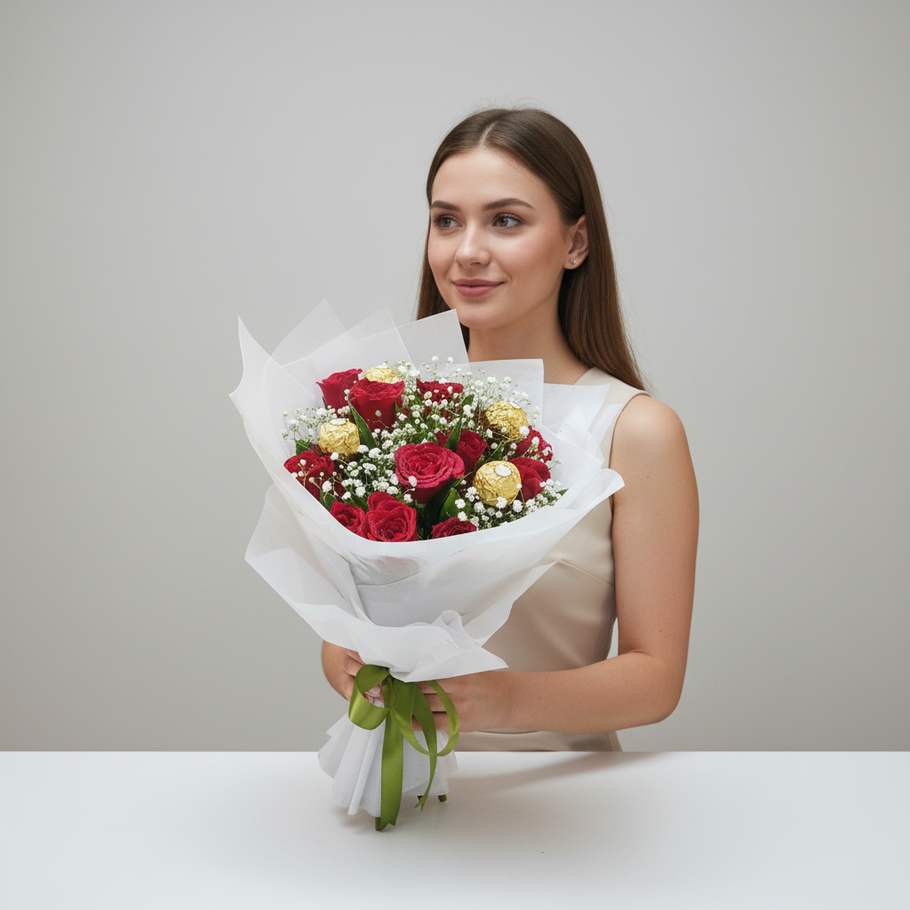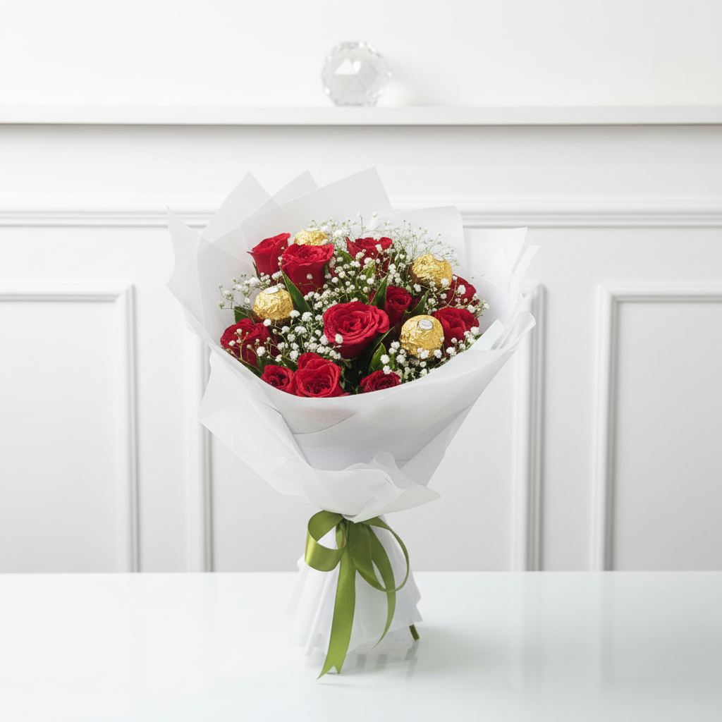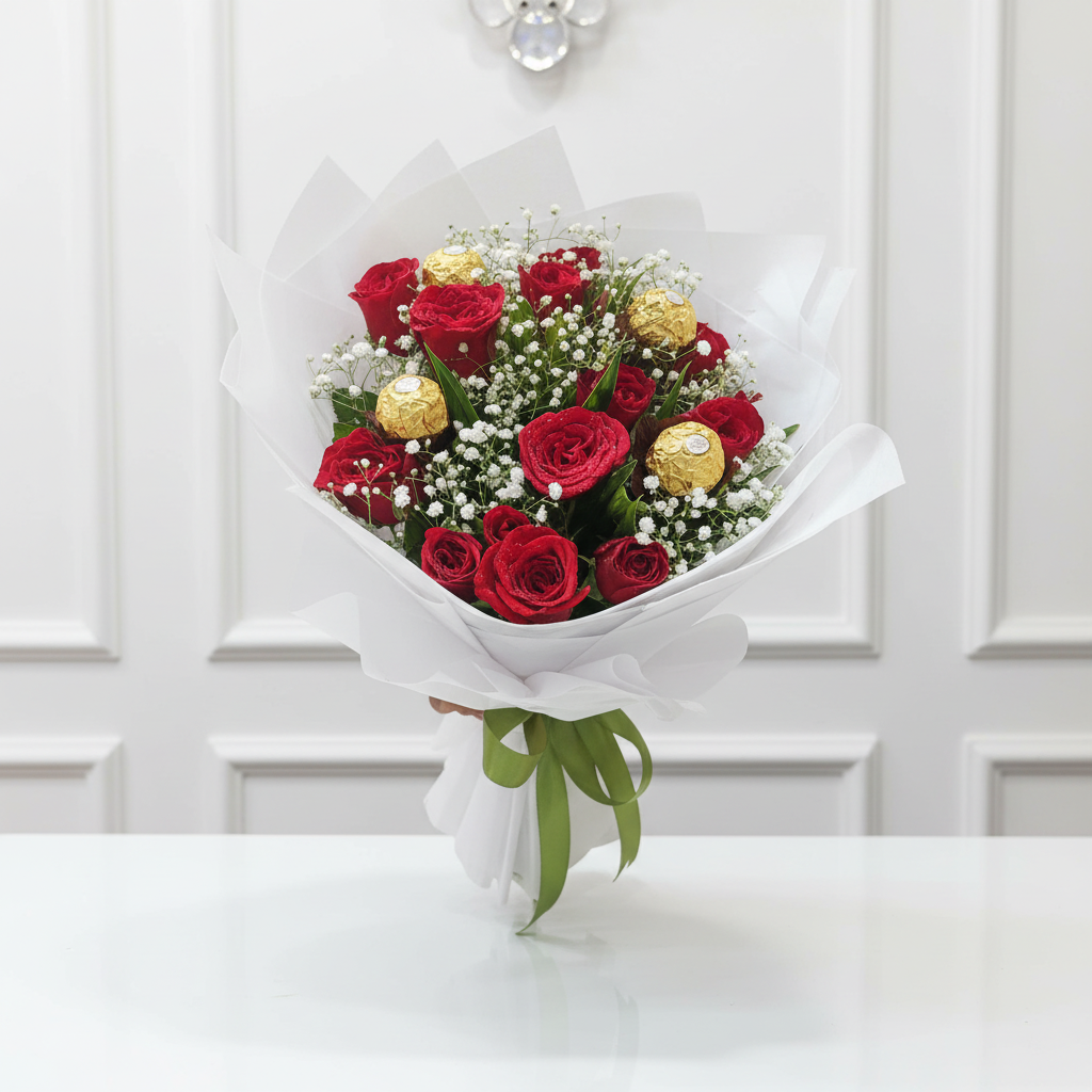 Make every moment unforgettable with this luxurious bouquet that blends classic romance with a delightful touch of sweetness. Designed to impress, this arrangement pairs premium red roses with Ferrero Rocher chocolates, surrounded by delicate baby’s breath and wrapped in elegant white paper.