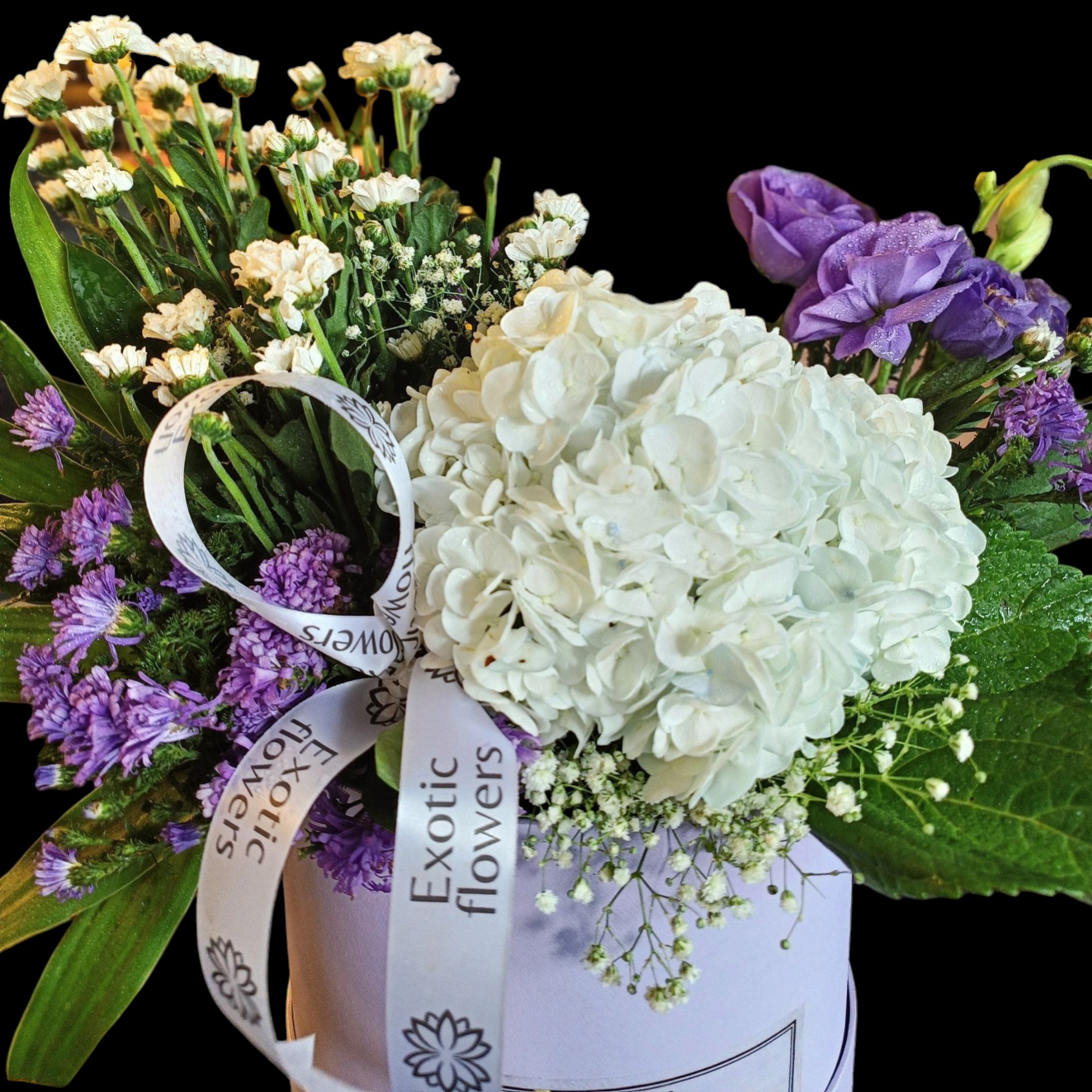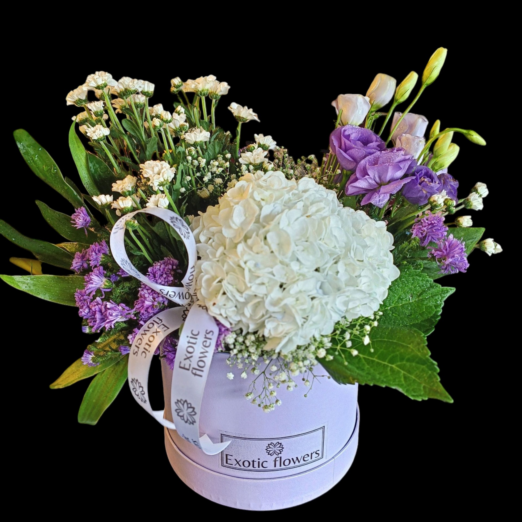 A graceful floral box arrangement featuring a large white hydrangea, purple lisianthus, lavender asters, white daisies, and baby’s breath, accented with lush greenery and presented in a pastel hat box with a decorative ribbon.