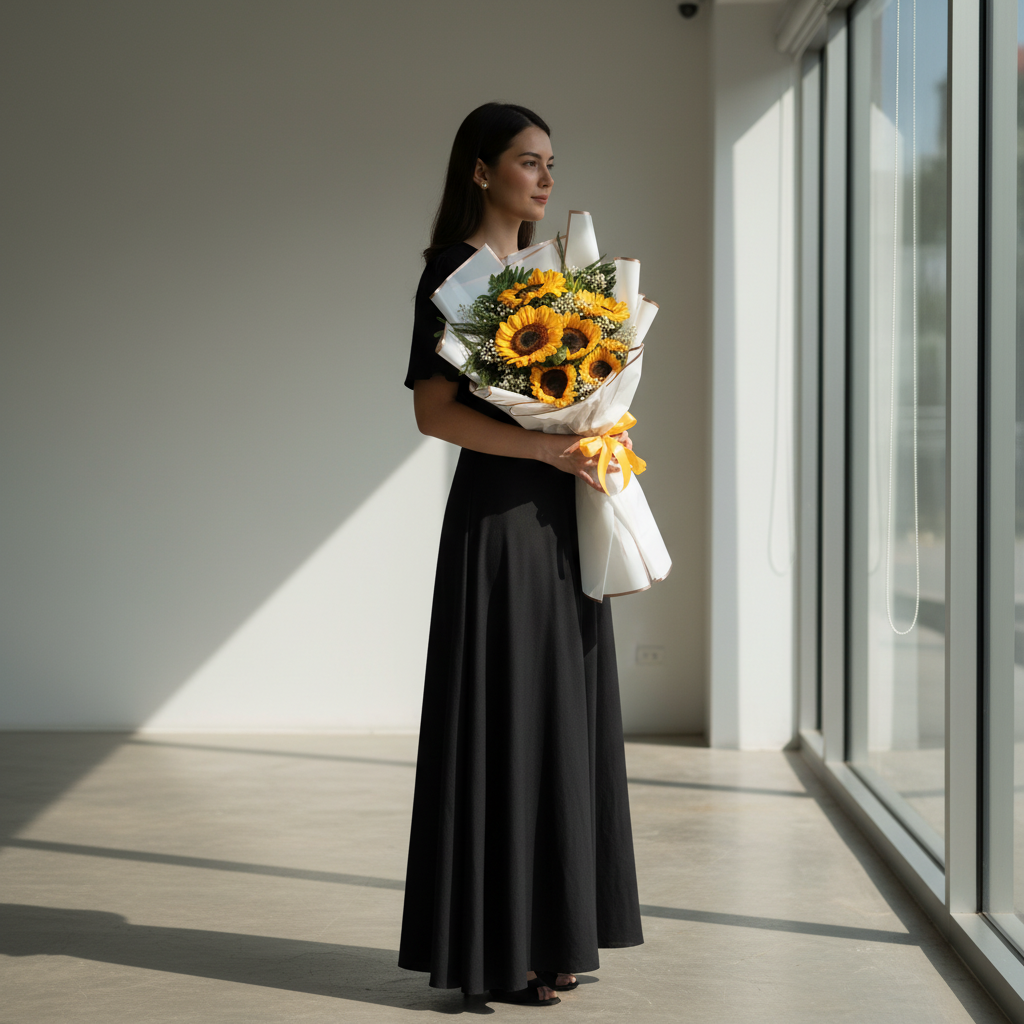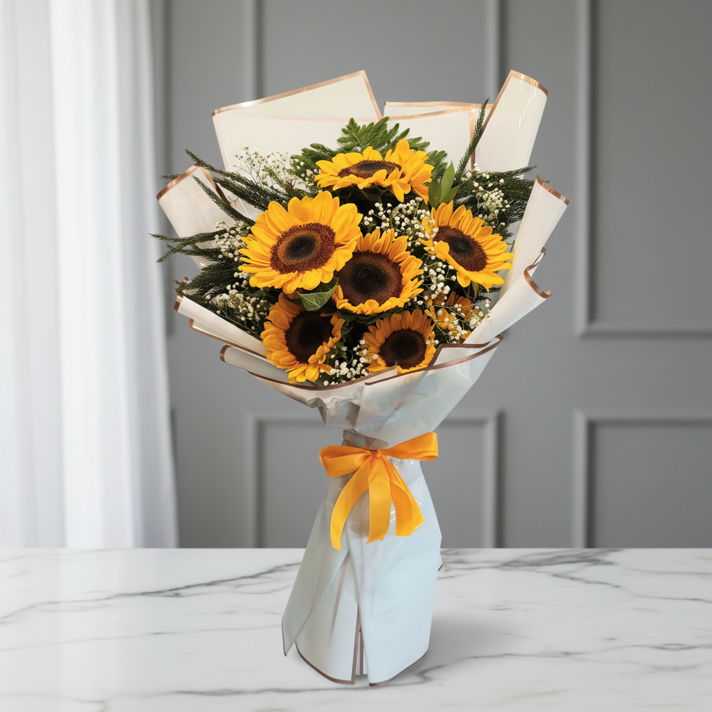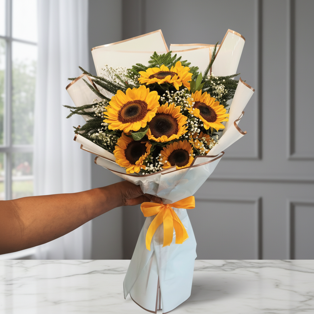 A striking bouquet of vibrant sunflowers, symbolizing joy, energy, and positivity. Enhanced with delicate baby’s breath and rich green foliage, the arrangement is wrapped in elegant ivory paper with golden accents and tied with a bright yellow ribbon. Held gracefully, it carries a warm, heartfelt presence—perfect for uplifting moments, celebrations, or expressing admiration and happiness.