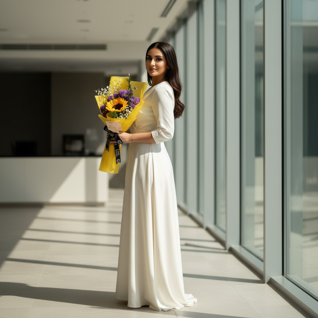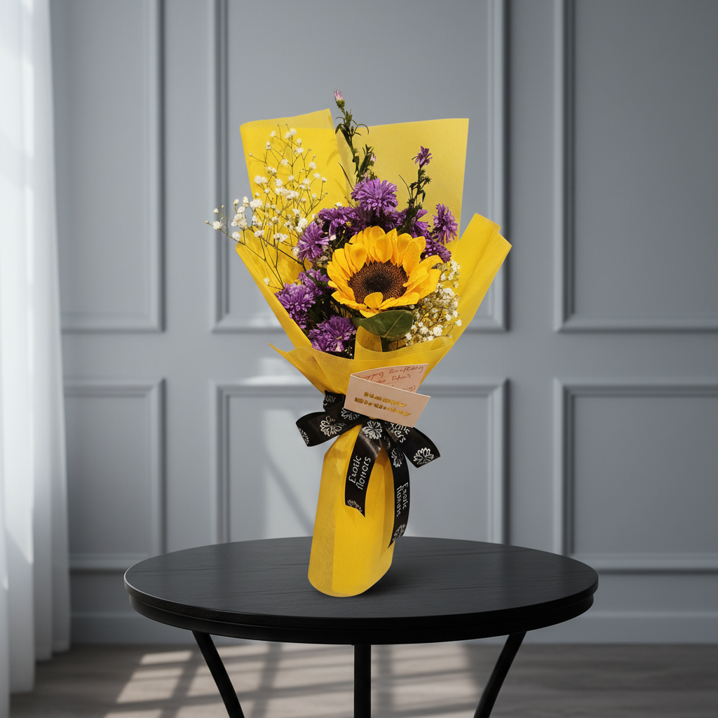 A vibrant and cheerful bouquet centered around a radiant sunflower, symbolizing happiness and positivity. Paired with rich purple asters and delicate baby’s breath, the arrangement is wrapped in bright yellow paper that enhances its sunny charm. Finished with a contrasting black ribbon and a heartfelt note, this bouquet is perfect for celebrations, birthdays, or sending warm, joyful wishes.