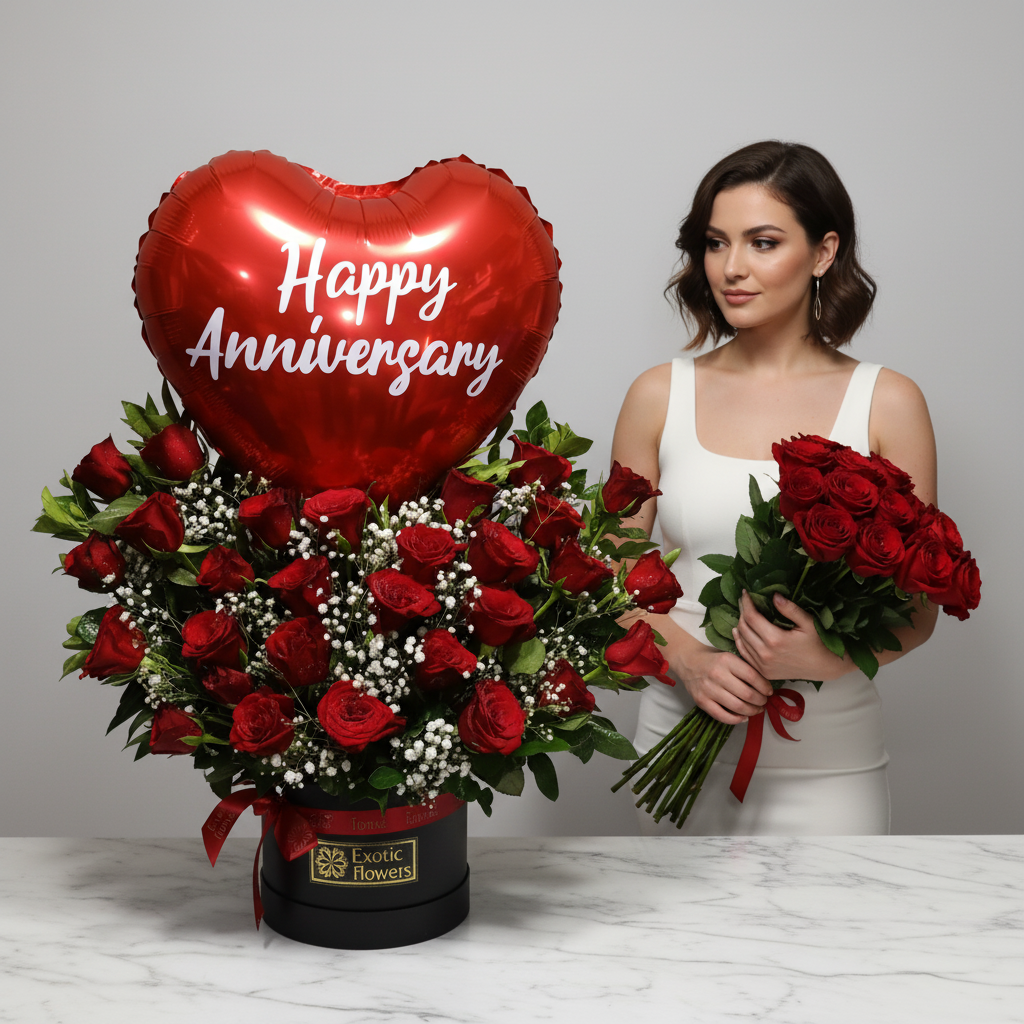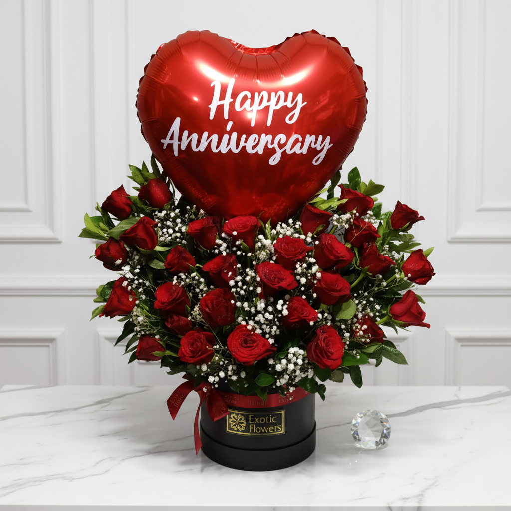 The roses are beautifully arranged in a sleek black luxury box, accented with delicate white baby’s breath and lush green foliage for a rich, balanced look. Topping the arrangement is a vibrant red heart-shaped foil balloon with “Happy Anniversary” written in stylish white script—making it a perfect ready-to-gift surprise.