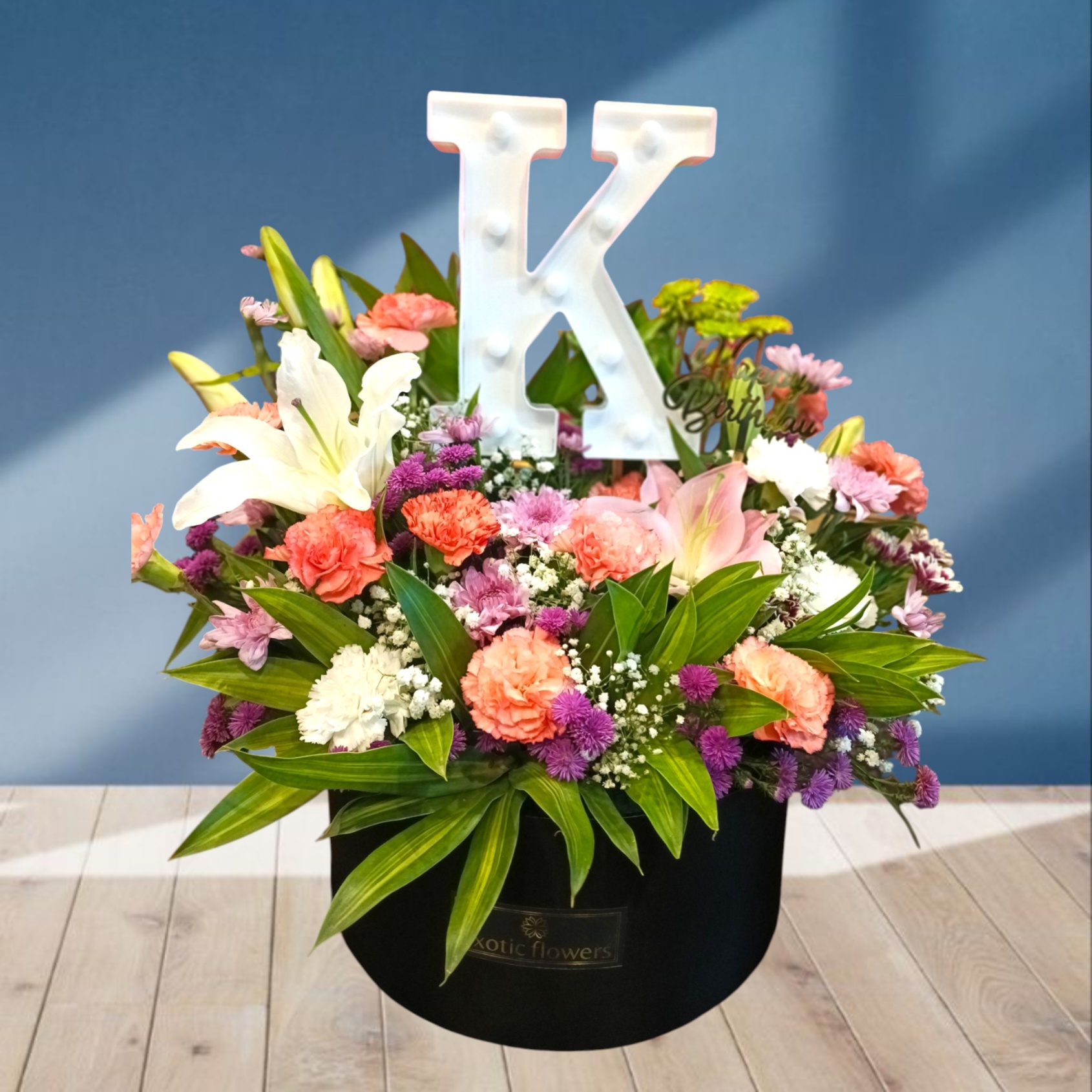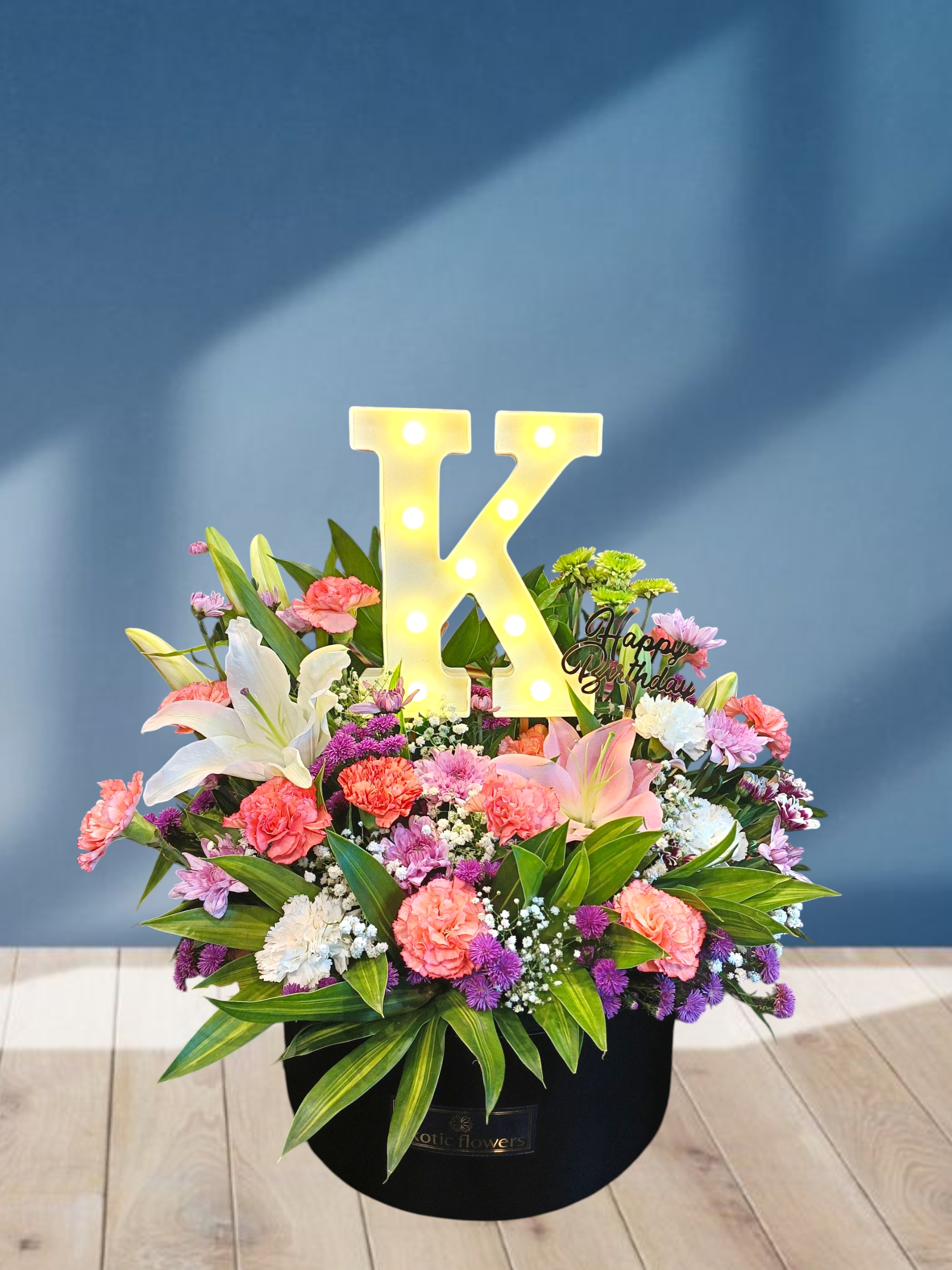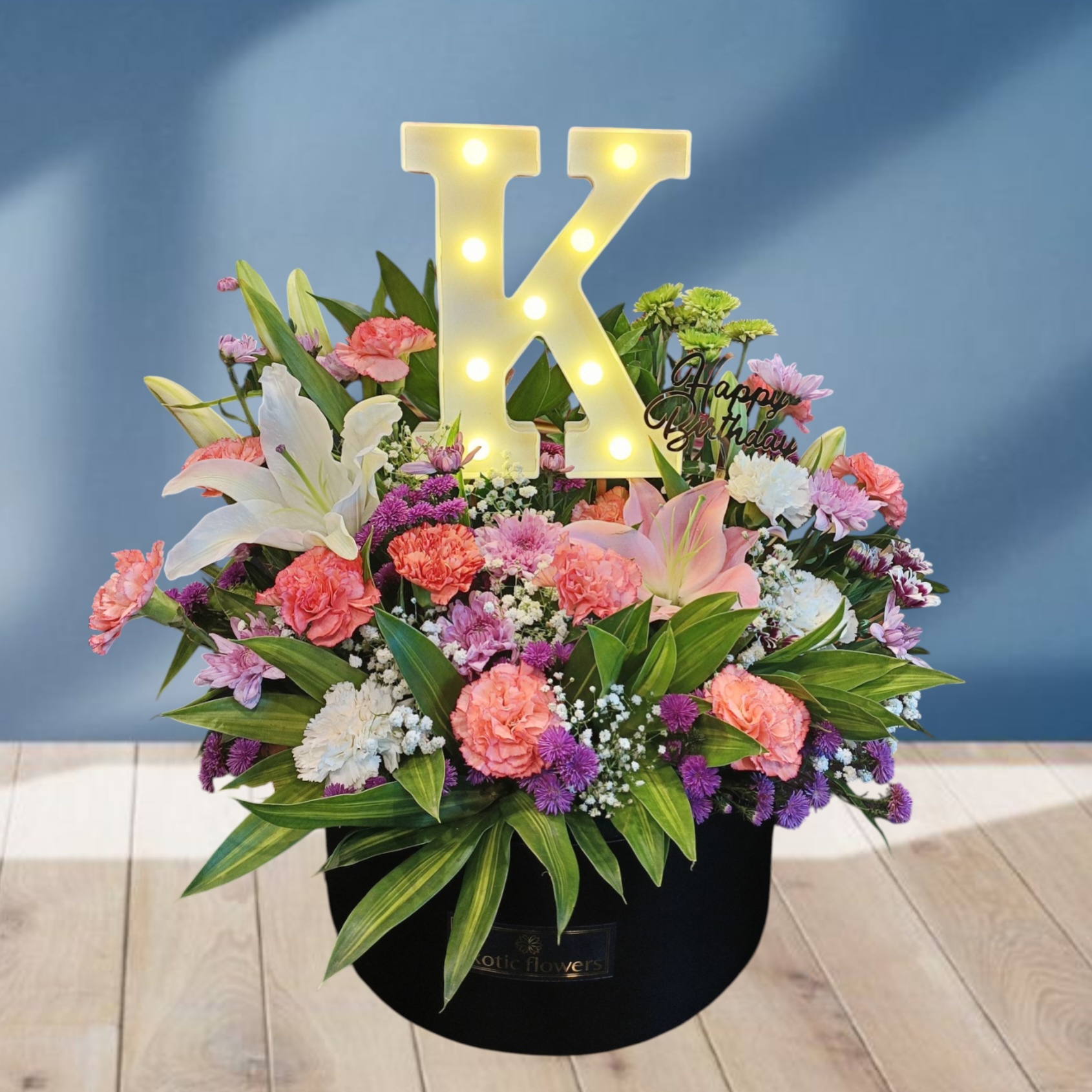 At the center, a personalized marquee-style initial “K” adds a unique and thoughtful touch, making this hamper extra special for birthdays, anniversaries, or milestone celebrations.