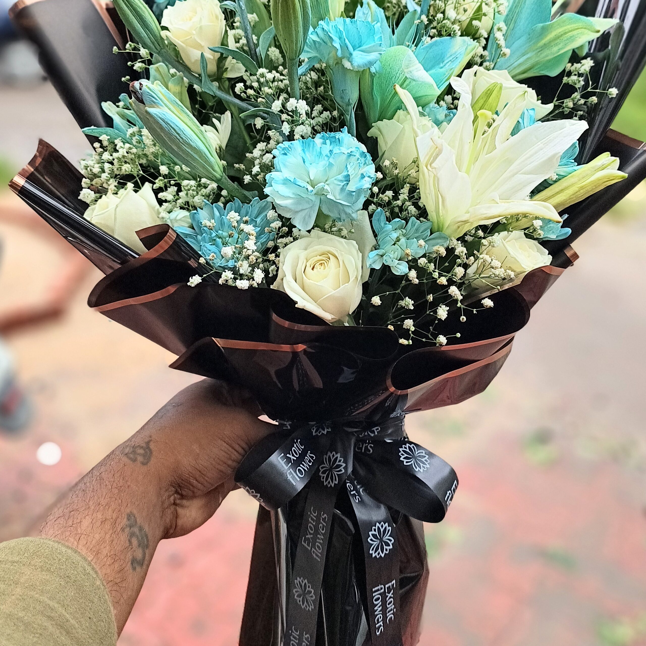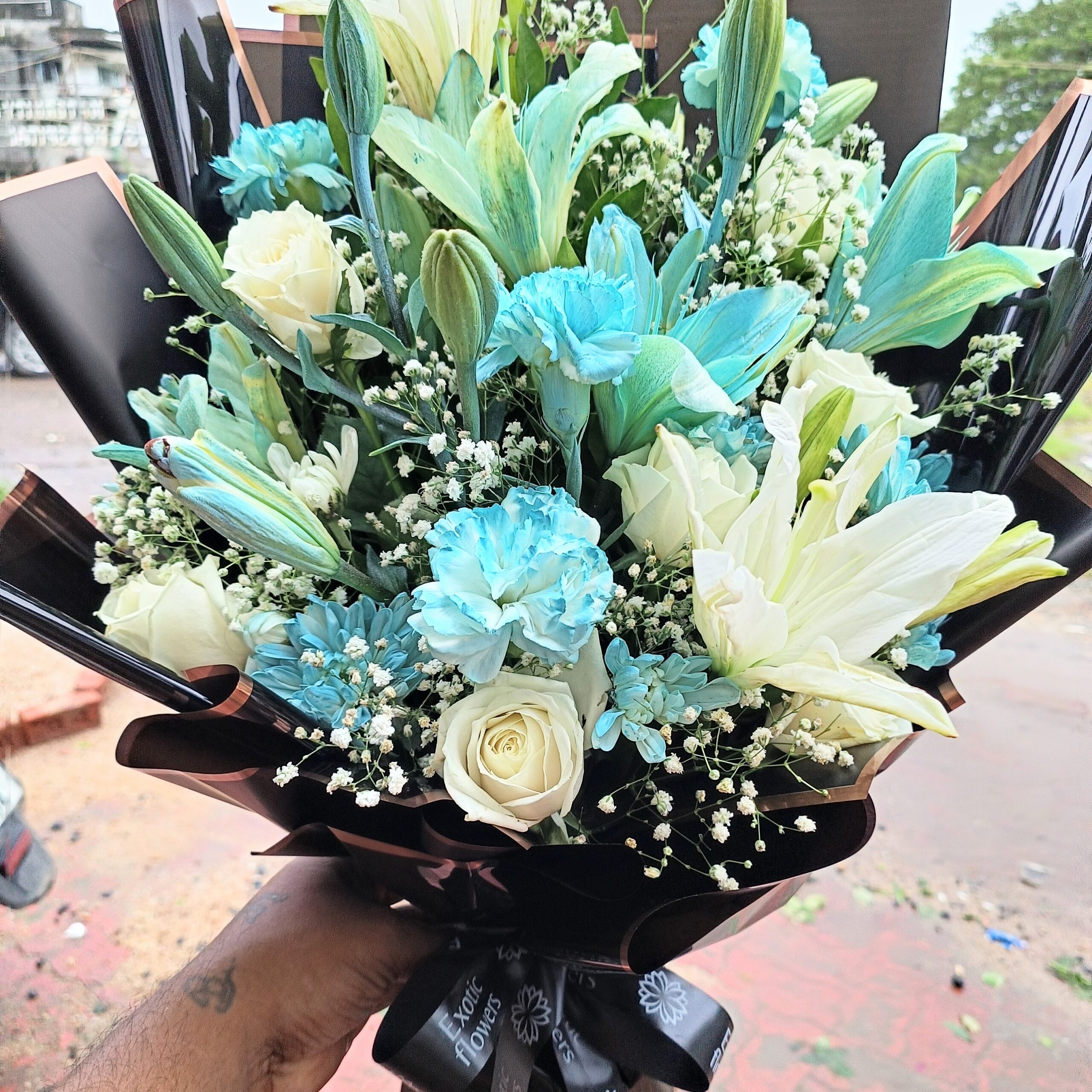 “A luxurious hand-tied bouquet featuring a stunning mix of white lilies, ivory roses, and aqua-blue carnations, beautifully accented with delicate baby’s breath and lush greenery. Wrapped in elegant black glossy paper with copper edges and tied with a stylish black ribbon, this bouquet exudes modern sophistication. Perfect for birthdays, anniversaries, weddings, or premium gifting occasions.”
