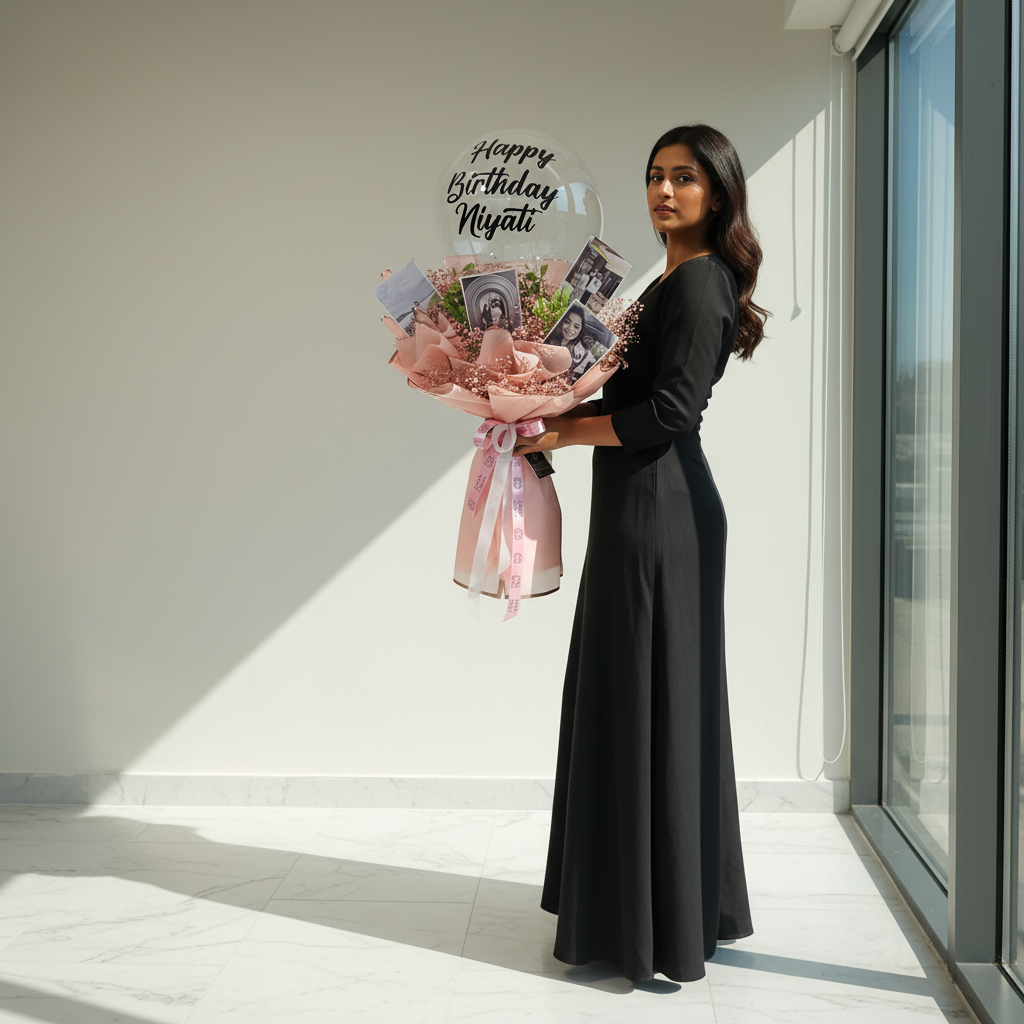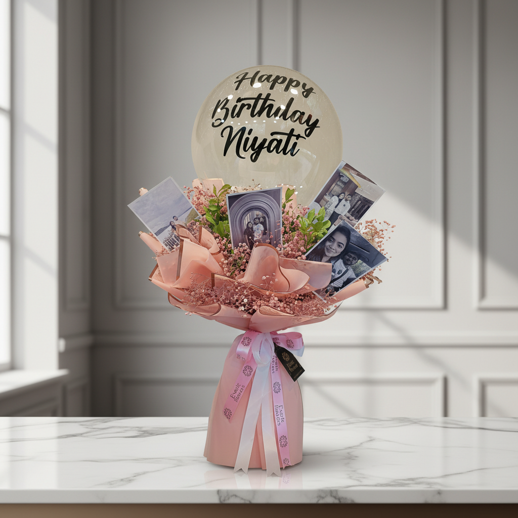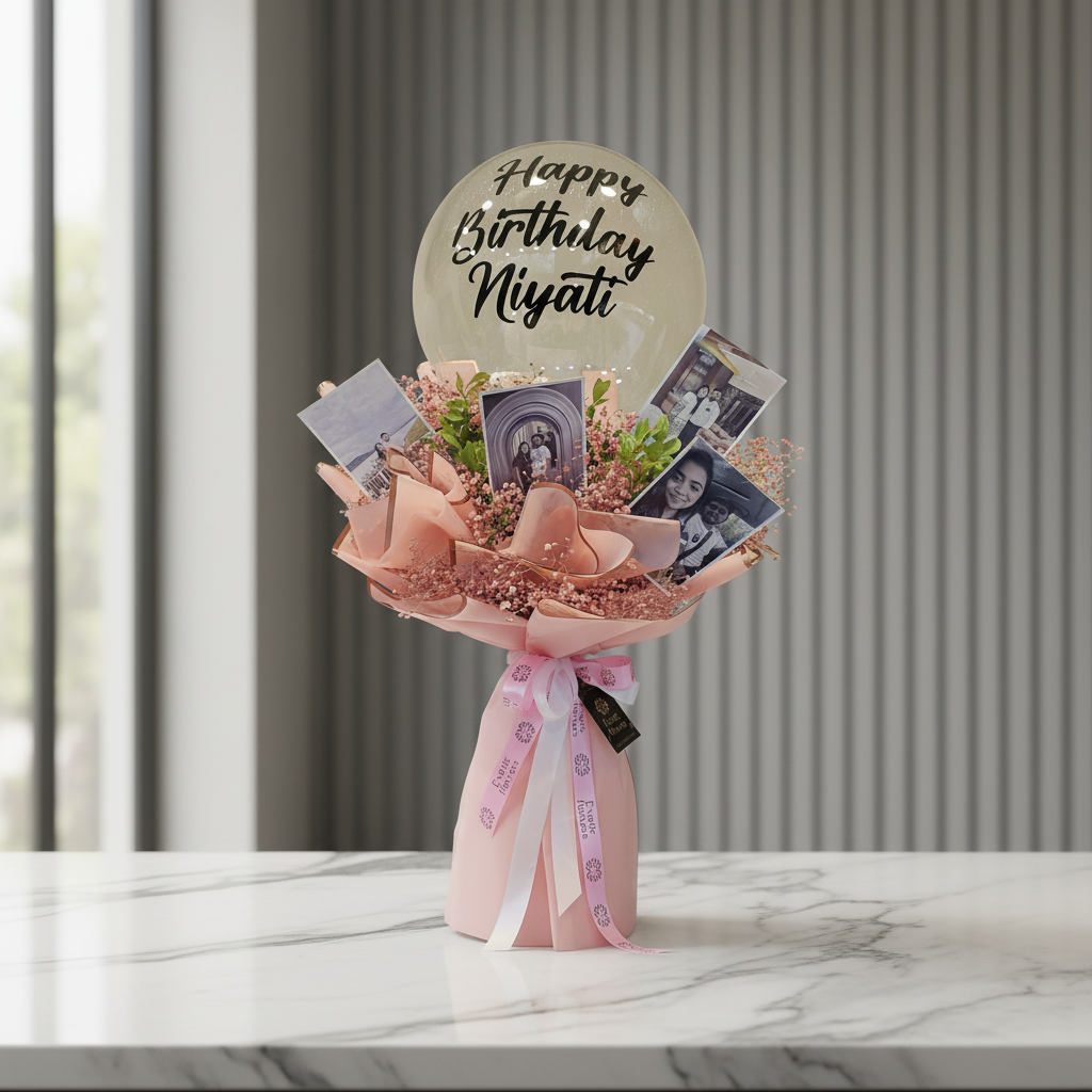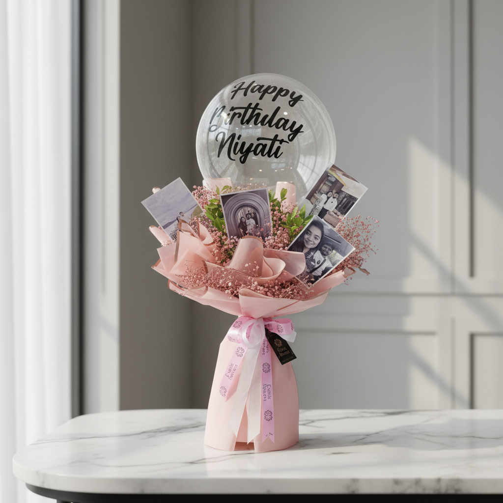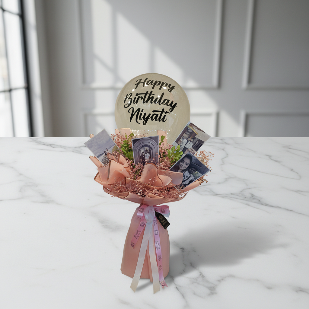 A uniquely personalized bouquet that blends soft pink florals with cherished photo memories, crowned by a transparent balloon carrying a heartfelt birthday message. Delicate baby’s breath and pastel wrapping enhance its dreamy, romantic feel, while the attached photos add a deeply emotional touch. Perfect for birthdays and special occasions, this bouquet is not just a gift—it’s a beautiful collection of memories wrapped in love.