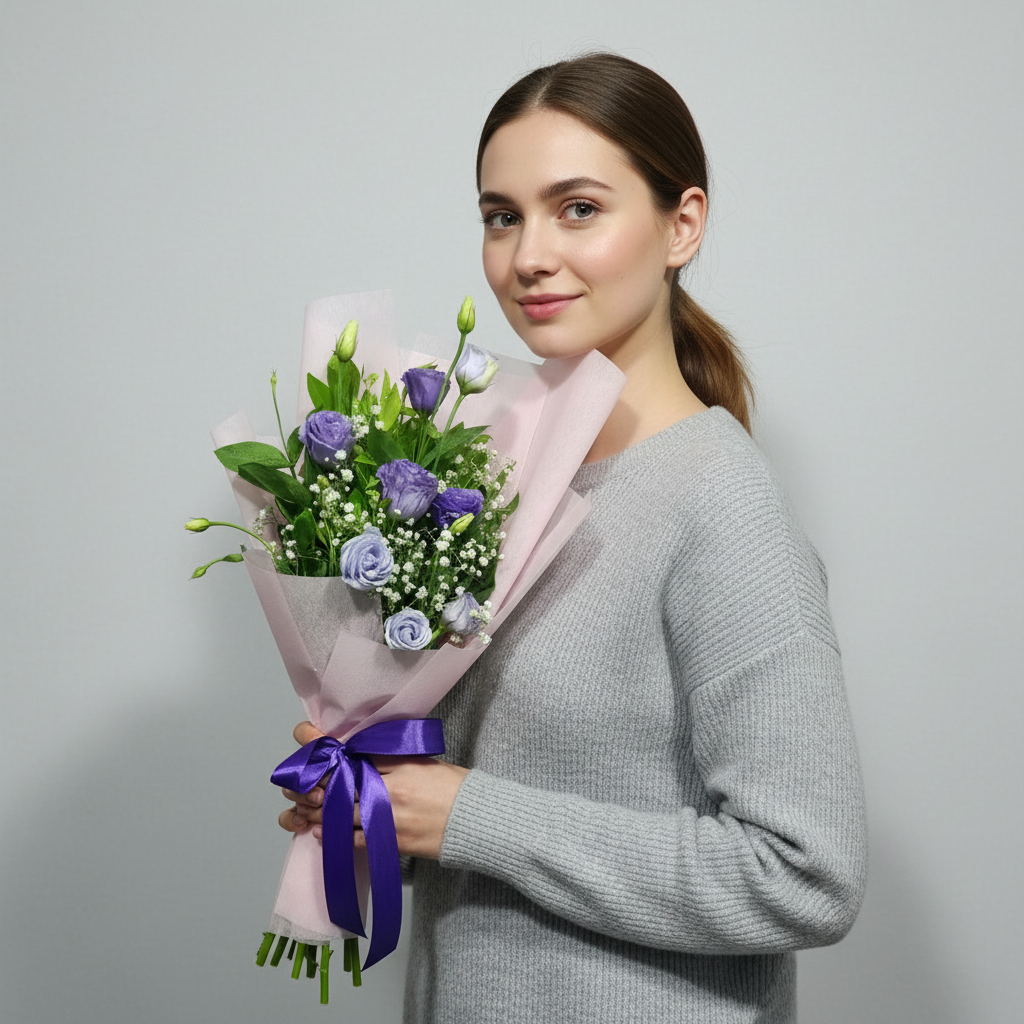 Graceful, soft, and full of charm—this lavender-themed bouquet is a perfect expression of calm beauty and heartfelt emotions. Featuring delicate purple lisianthus blooms paired with fresh green buds and subtle white fillers, this arrangement creates a soothing and elegant color palette.