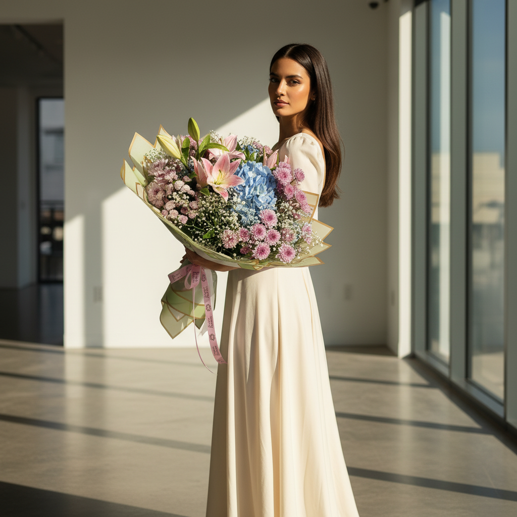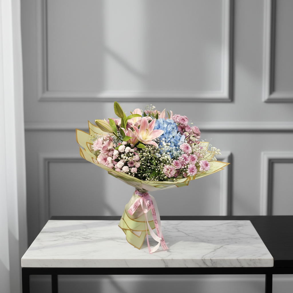 A graceful blend of soft pink lilies, delicate chrysanthemums, and a soothing blue hydrangea, this bouquet exudes charm and serenity. Accented with airy baby’s breath and fresh greenery, and wrapped in translucent golden-edged paper with a gentle pink ribbon, it creates a perfect balance of romance and sophistication—ideal for heartfelt gestures, anniversaries, or elegant celebrations.