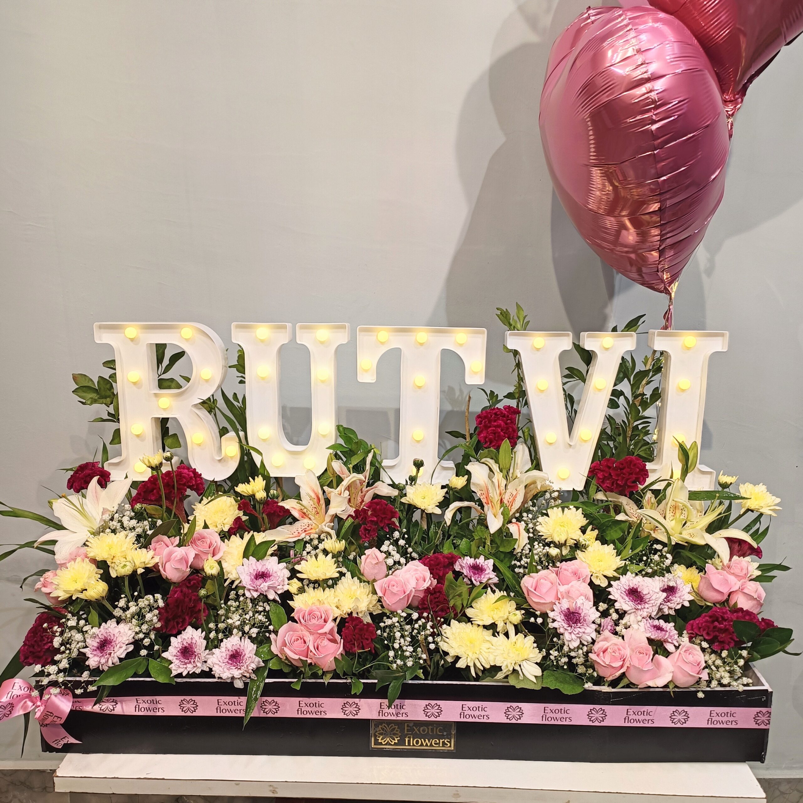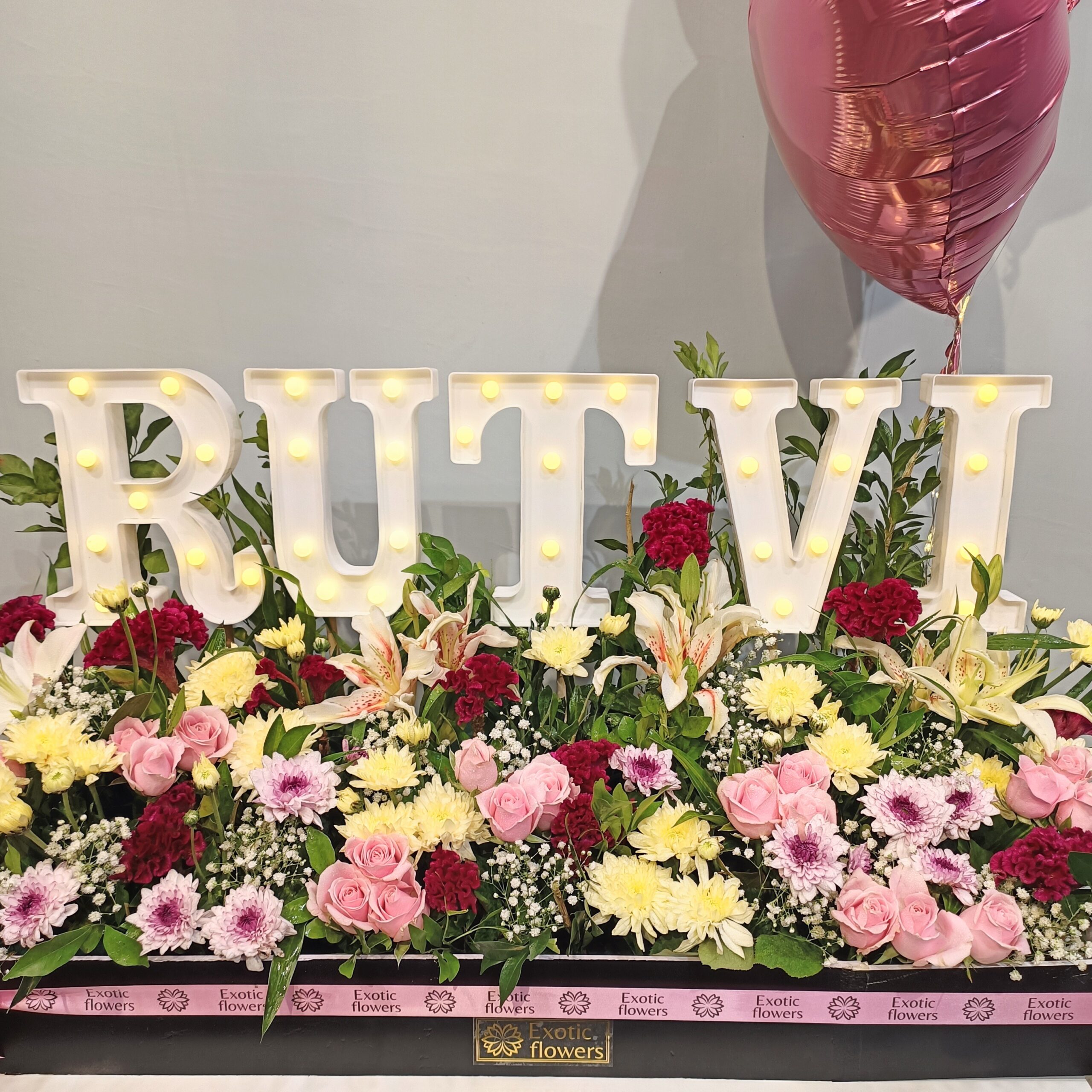 Elegant LED marquee letters spelling out RUTVI, making it a personalized centerpiece.