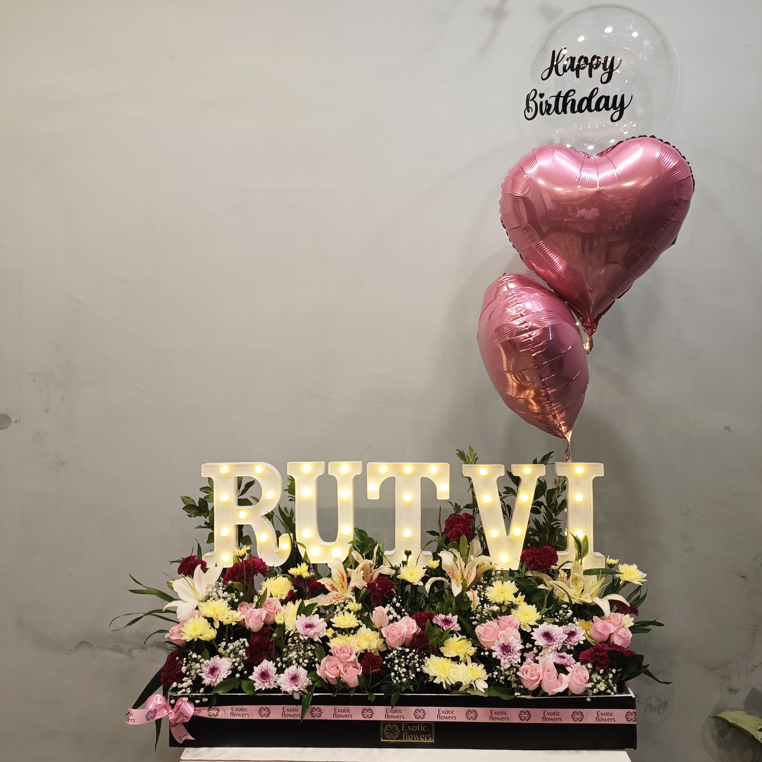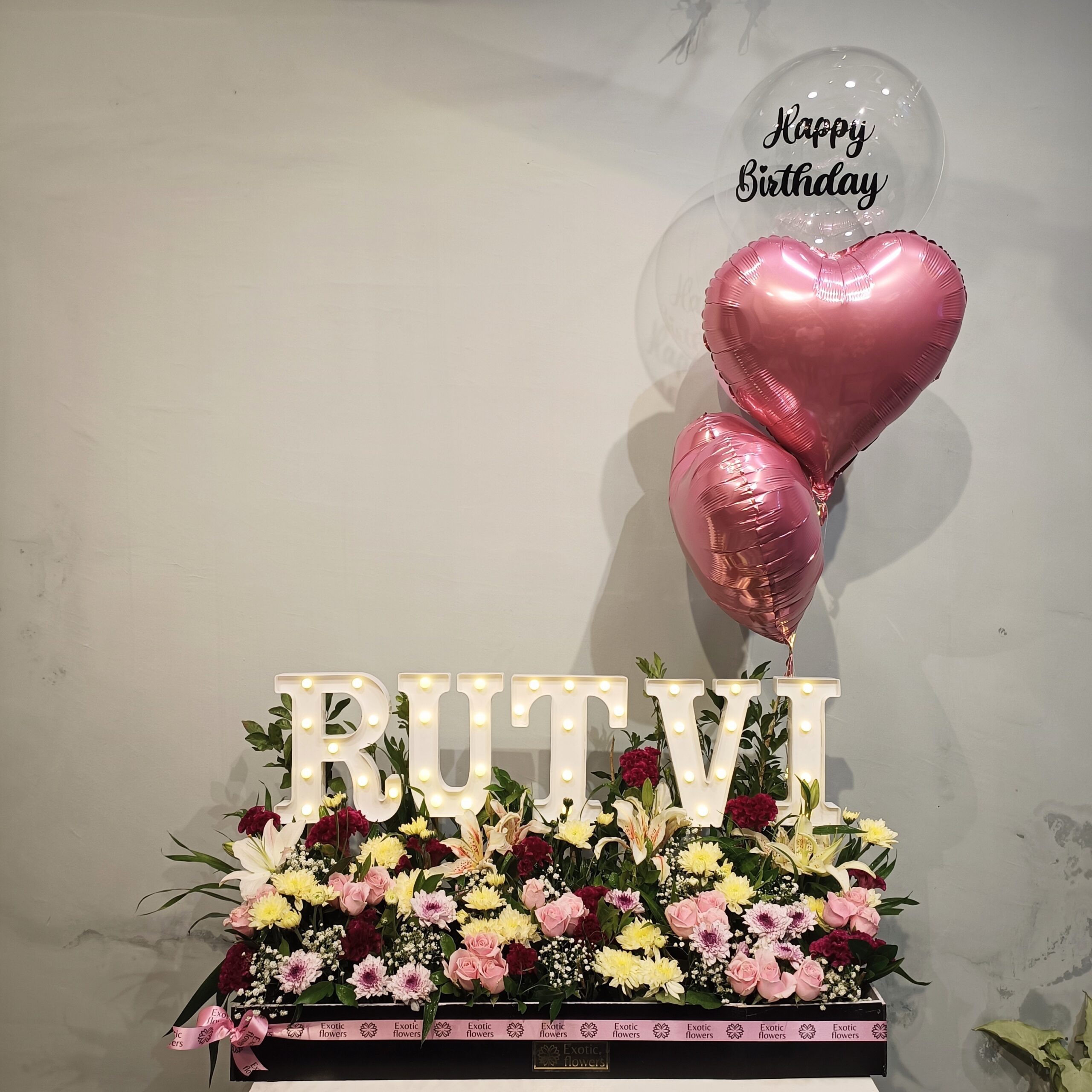 This hamper is a stunning blend of flowers, lights, and balloons – ideal for creating a memorable birthday surprise. 🎉🌸🎈