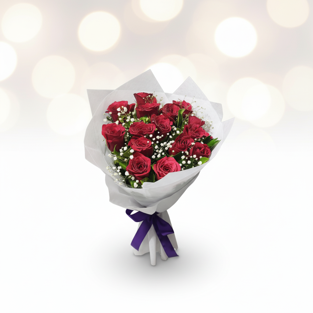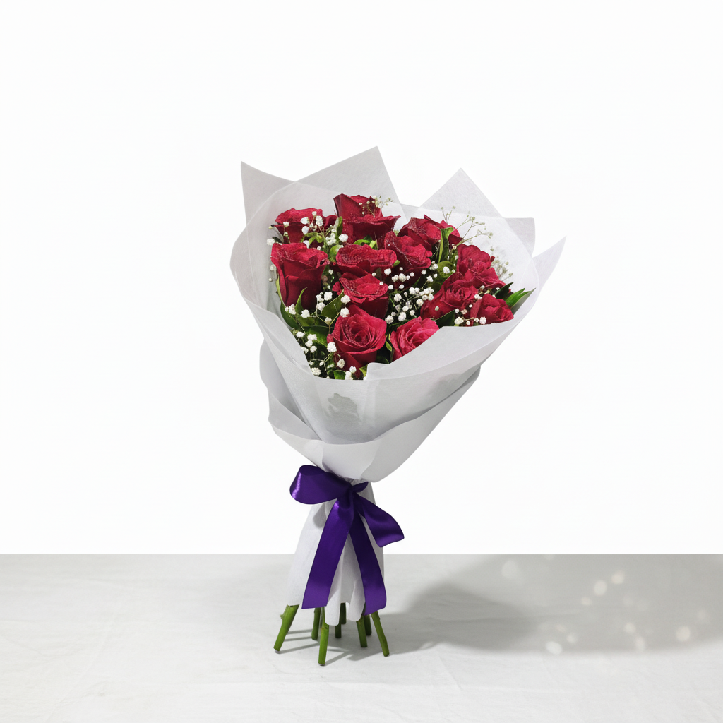 15 roses bouquet with white jipsuliya & fillers and white nonoven tissu paper wrapping