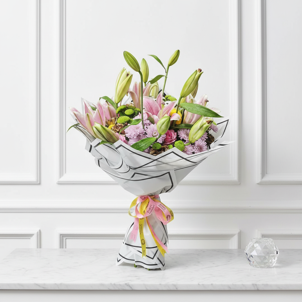 An elegant and vibrant mixed flower bouquet featuring fresh pink lilies in both bloom and bud stages, complemented by soft pink chrysanthemums, delicate roses, and textured green button blooms. The arrangement is enriched with lush green leaves, adding depth and freshness. Wrapped in a stylish white sheet with bold black geometric accents and finished with a pastel pink and yellow ribbon, the bouquet looks modern and eye-catching. Displayed on a white marble surface against a classic white panelled wall, this bouquet has a premium, contemporary appeal—ideal for celebrations, congratulations, birthdays, or sophisticated gifting.