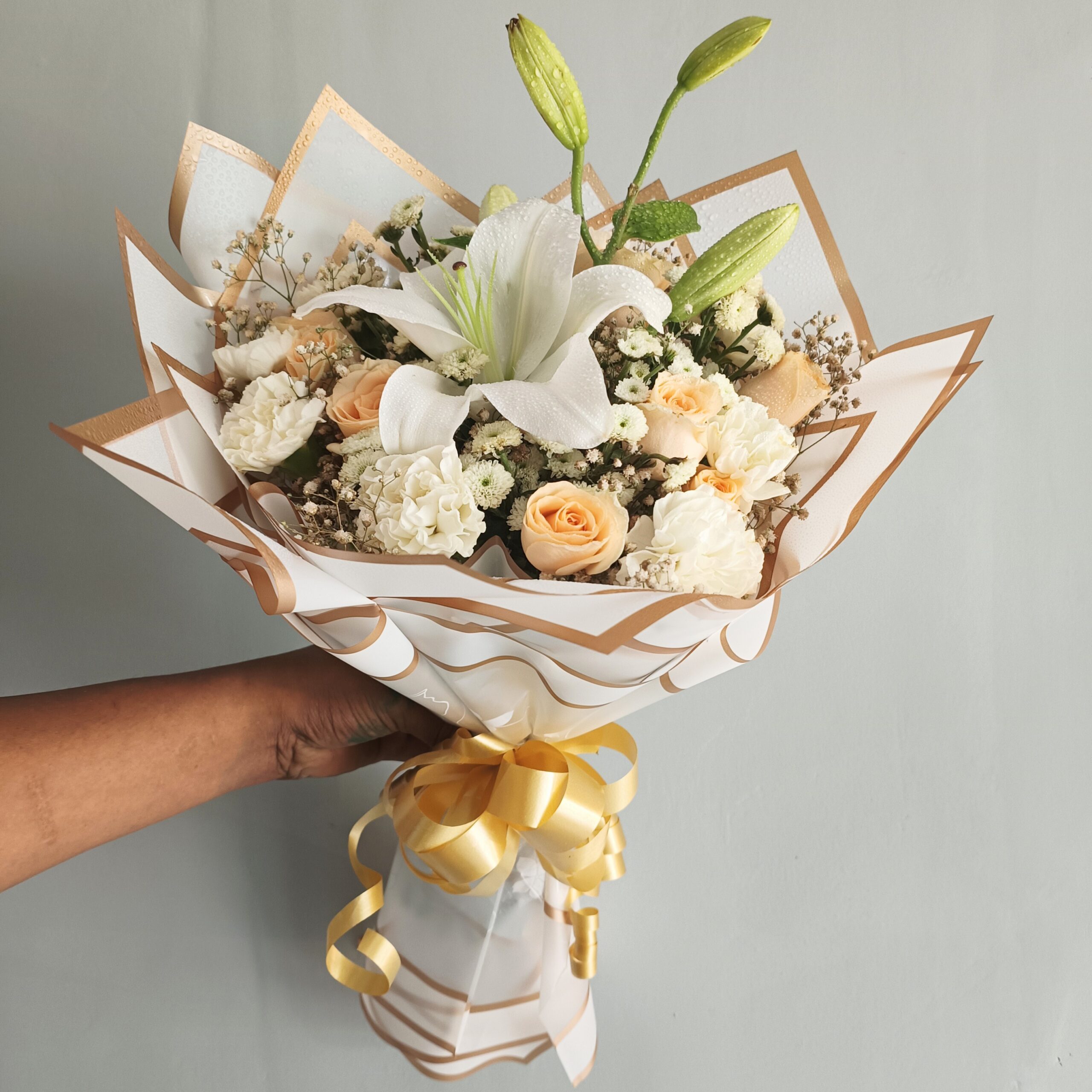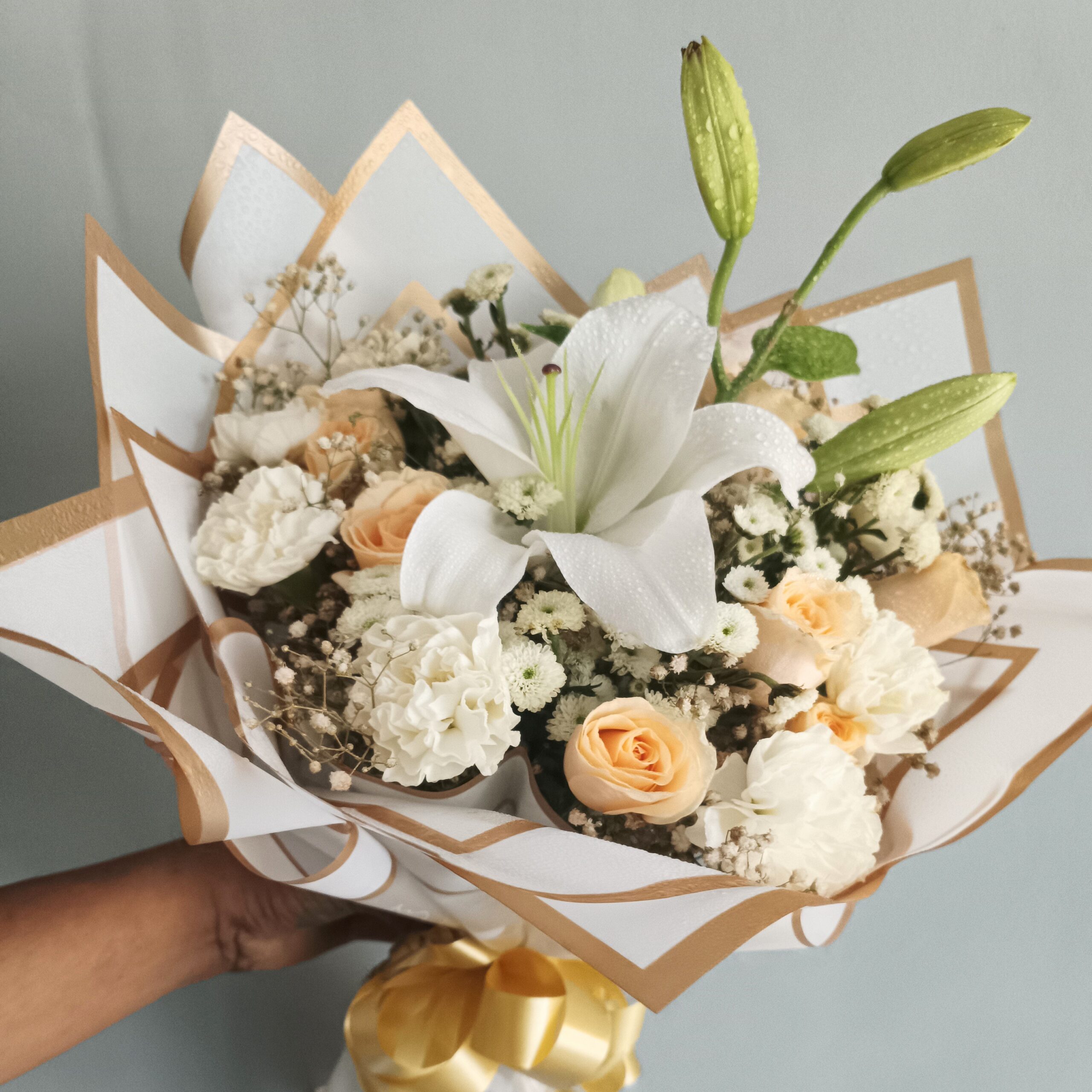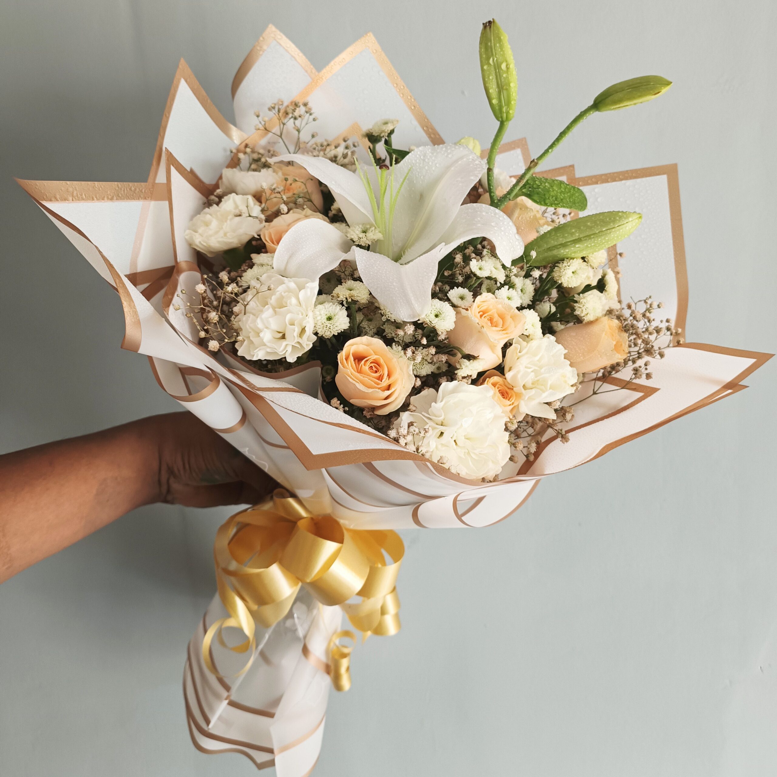A timeless and elegant bouquet designed to brighten any occasion. This hand-tied arrangement features a radiant White Lily as the centerpiece, symbolizing purity and grace. Surrounding it are delicate Peach Roses, paired with soft White Carnations and Baby’s Breath, creating a gentle blend of romance and freshness.